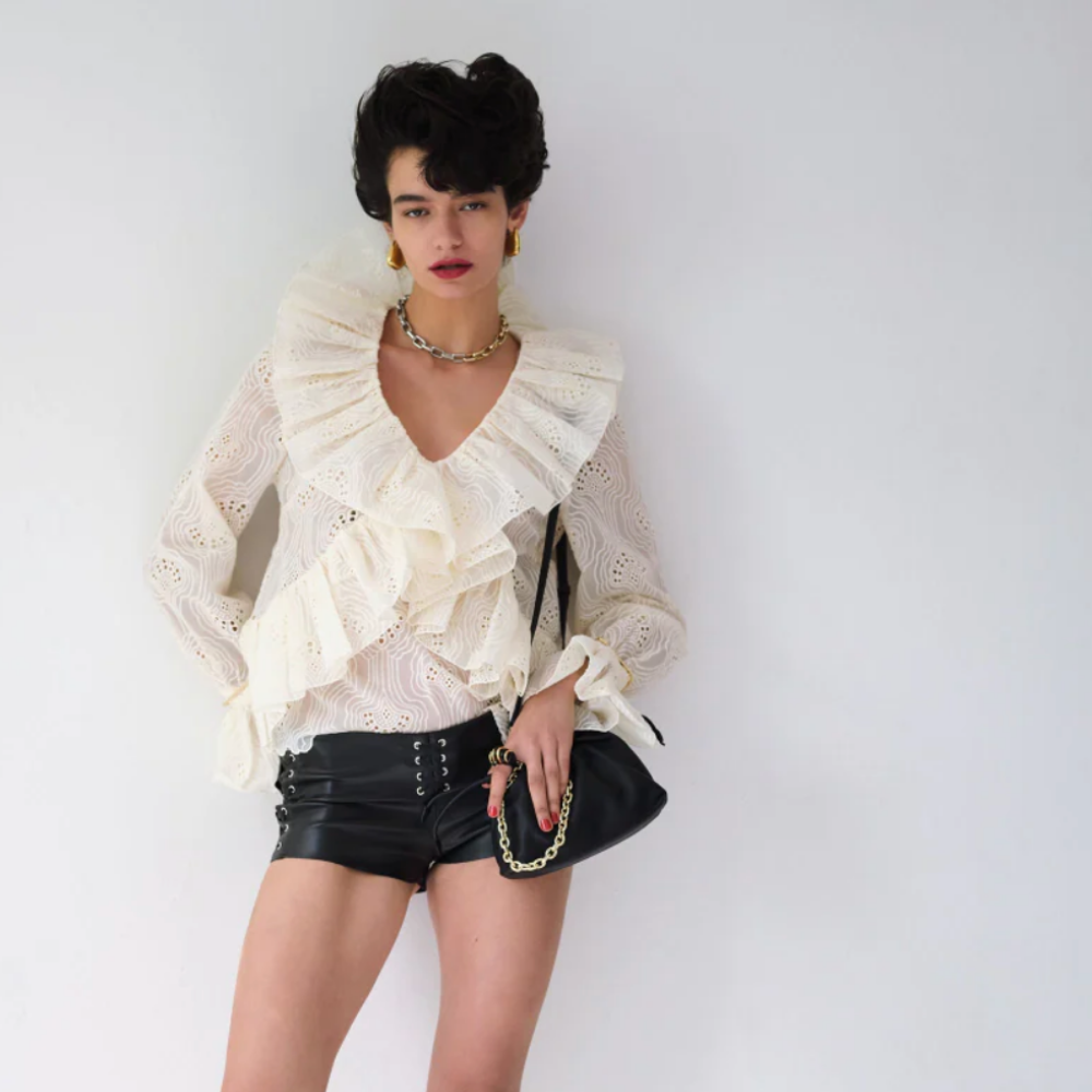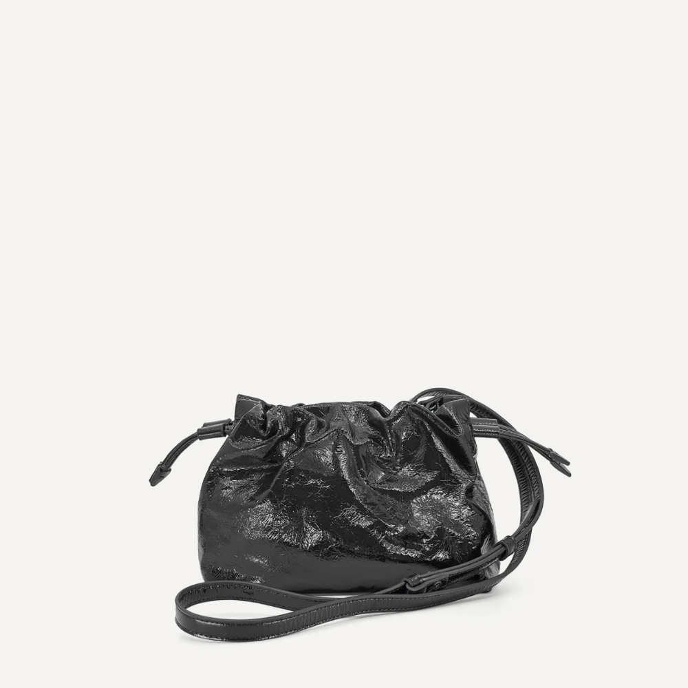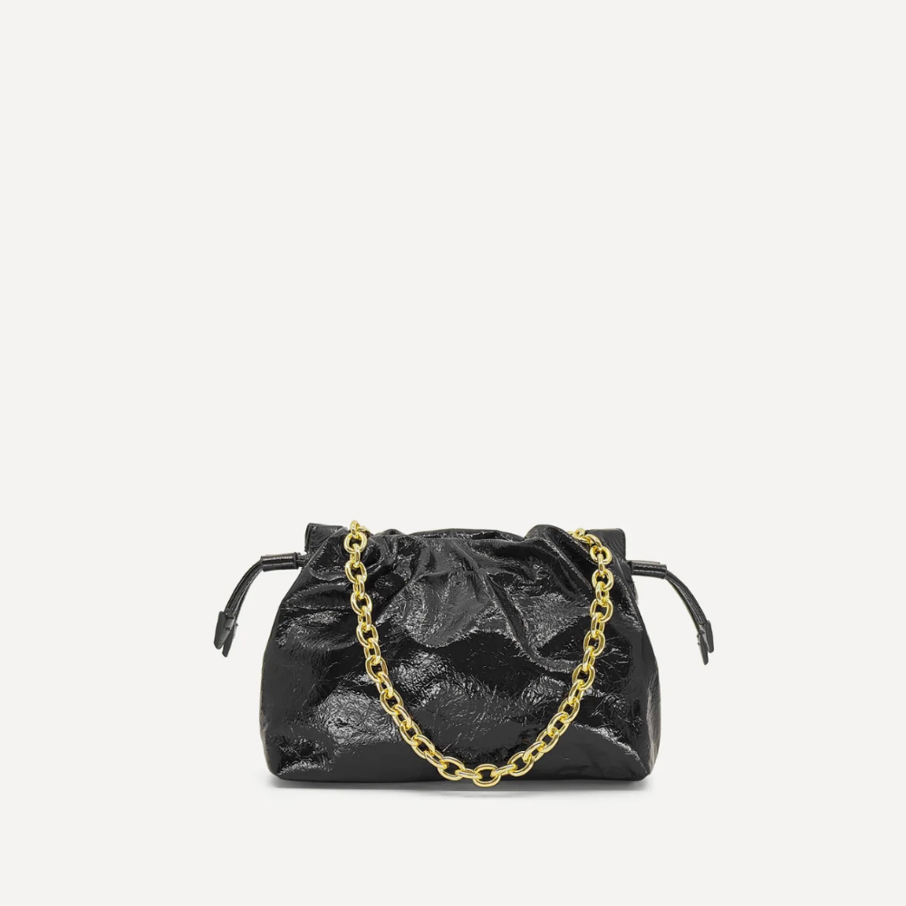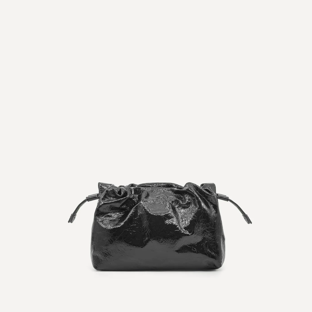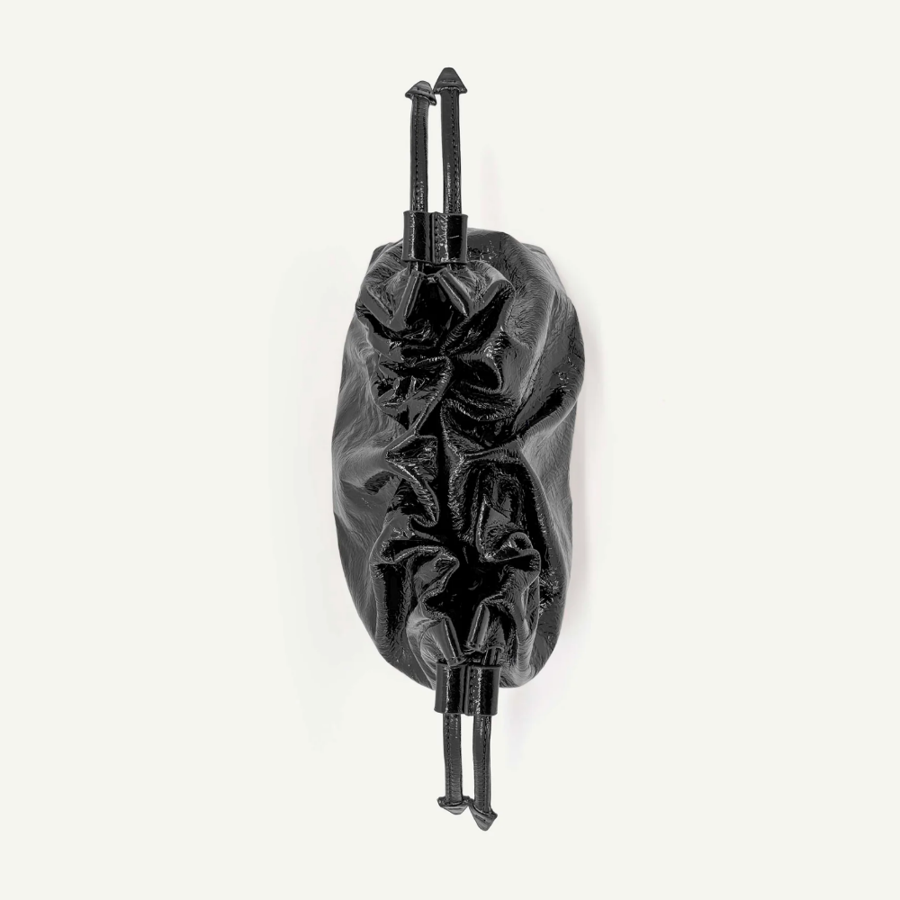 The Alexandra Petite Clutch features a ruched drawstring closure with statement arrow ends and a magnetic closure,