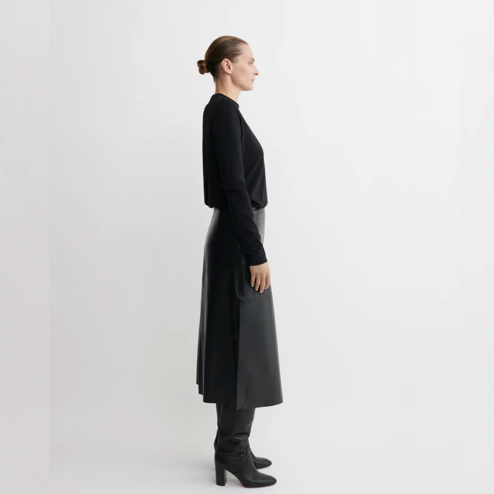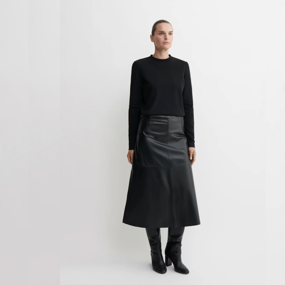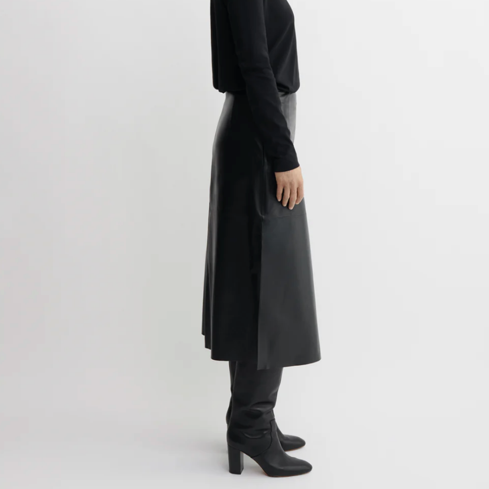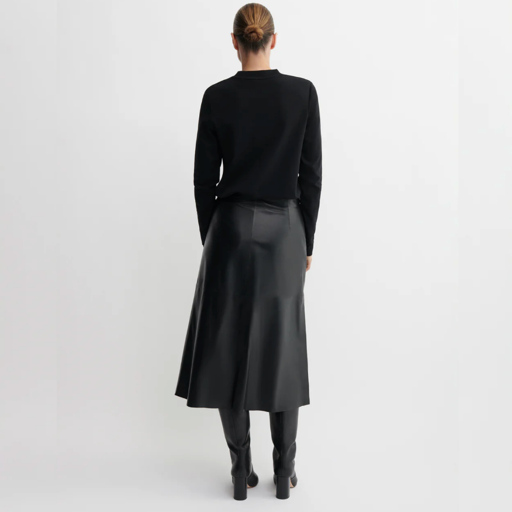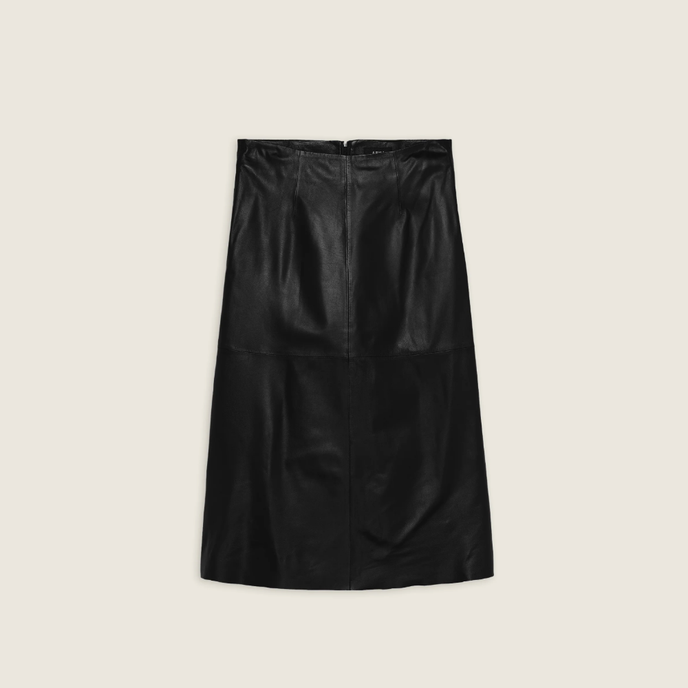 This leather skirt features a flattering silhouette that hugs the waist and gently flares out, striking the perfect balance between edgy and elegant.