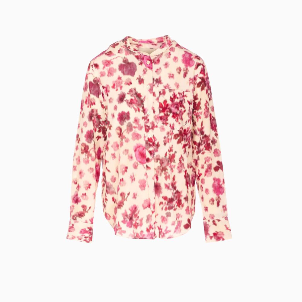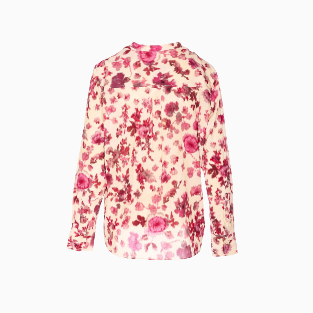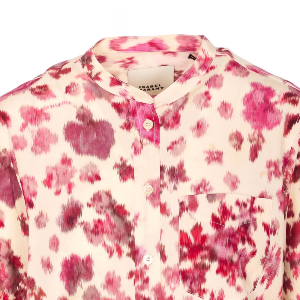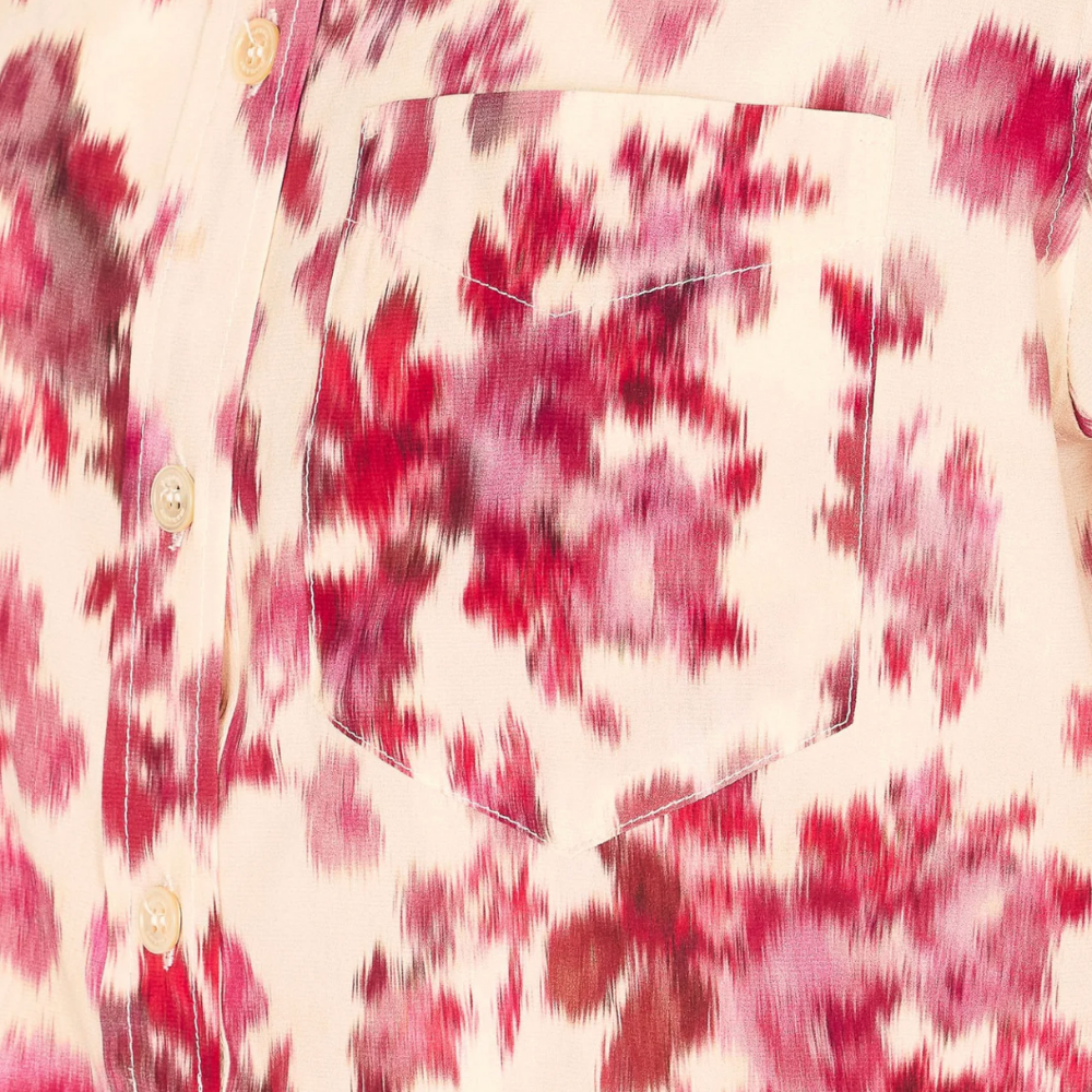 Isabel Marant Rusak top in off-white stretch silk with pink roses print.