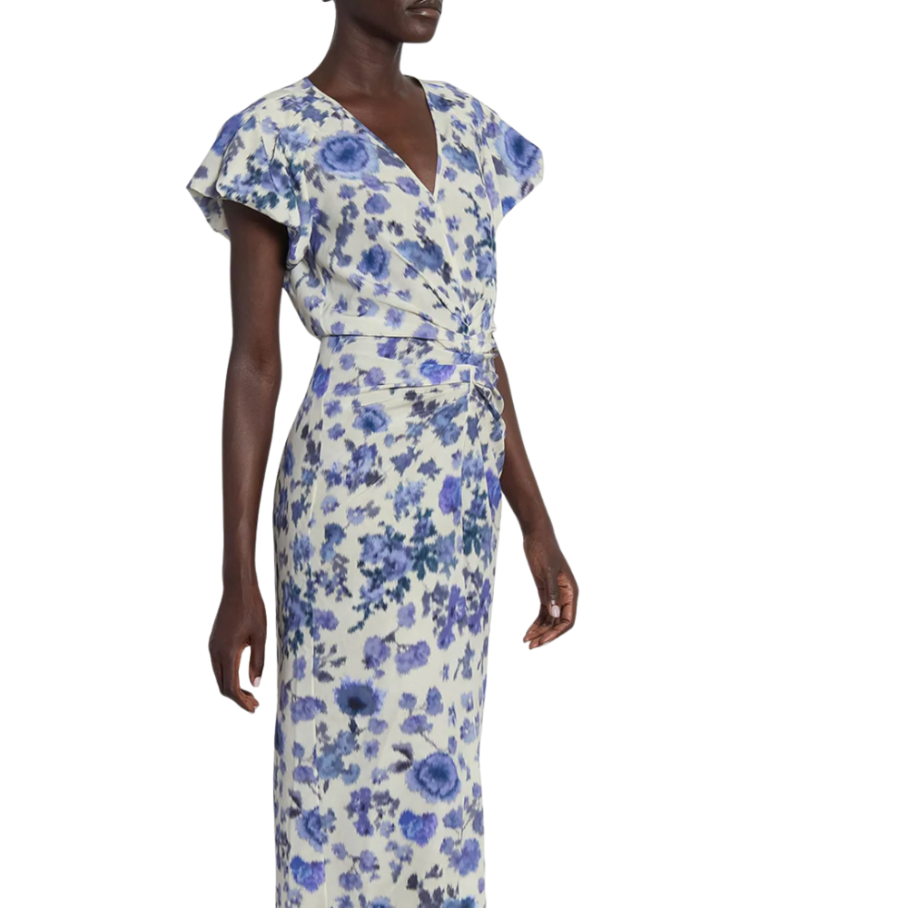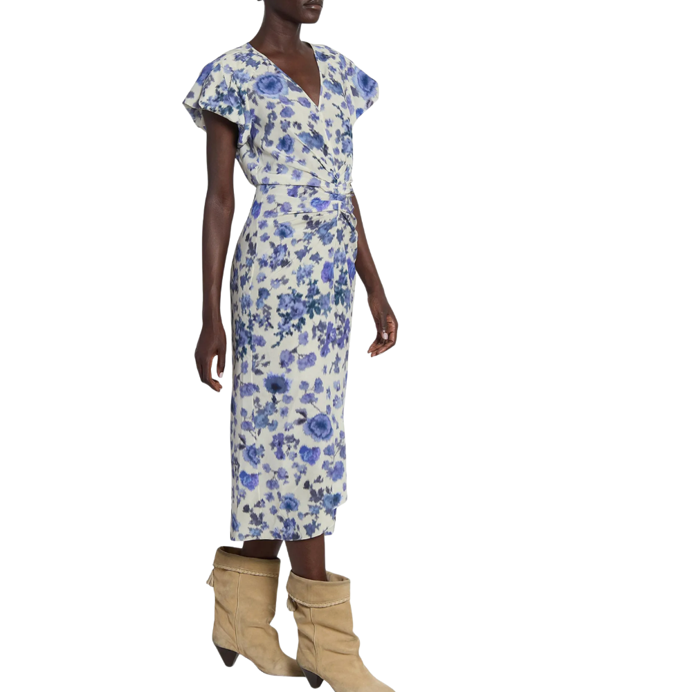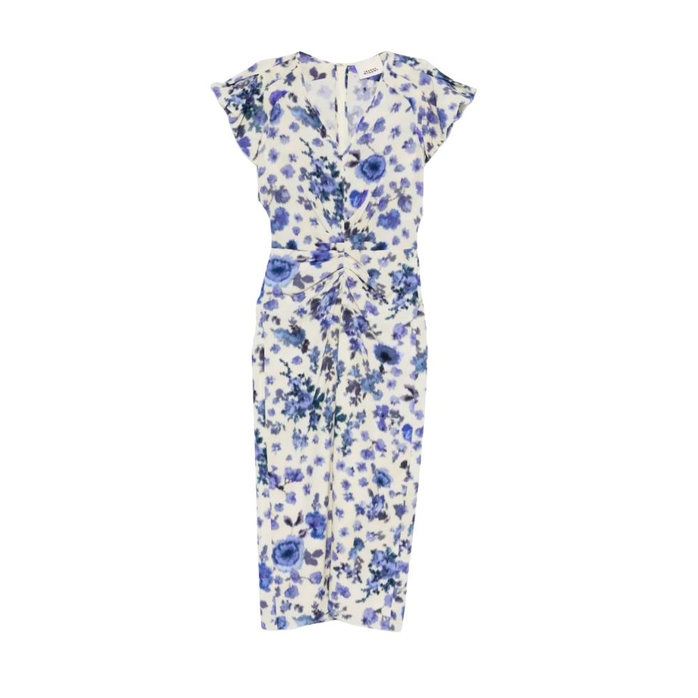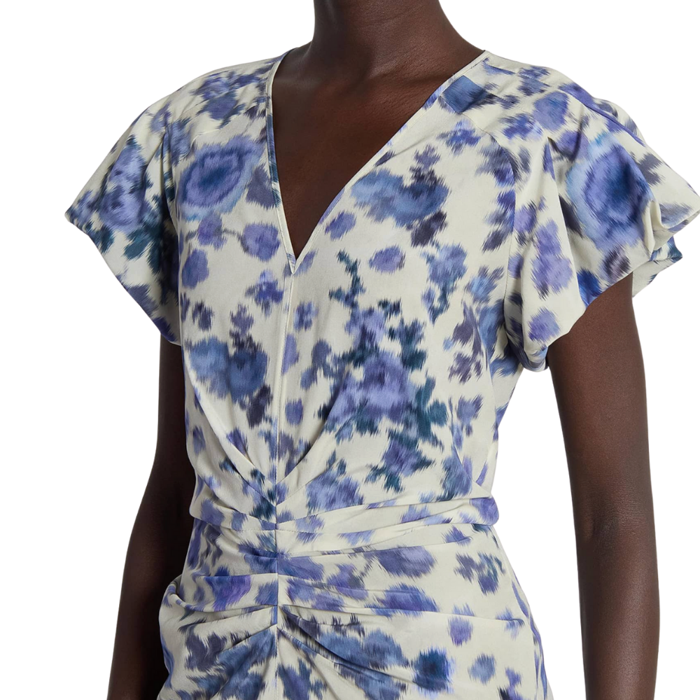 Isabel Marant Terenae dress in off-white stretch silk with blue roses print.