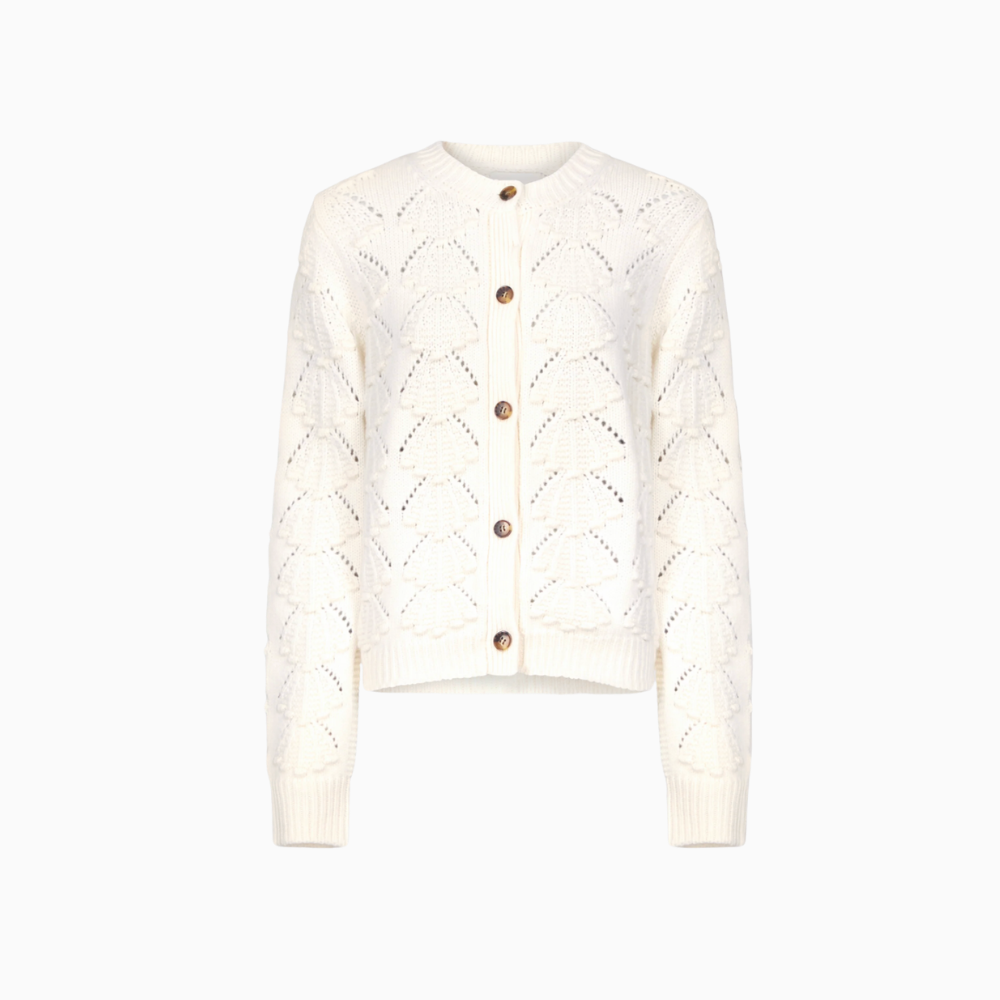 Round neck cardigan with long sleeves and boxy fit, beautifully knitted with a shell pattern throughout.