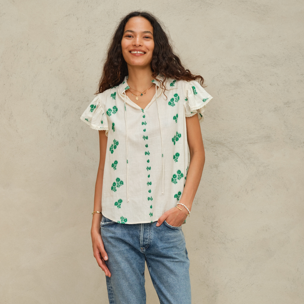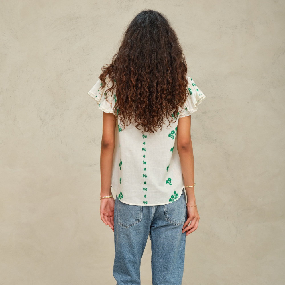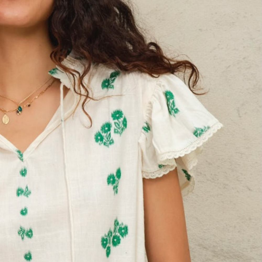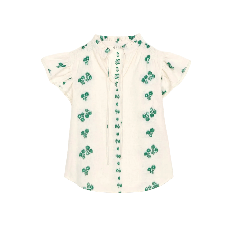 M.A.B.E. Iris top in ivory white with green flowers stitching.