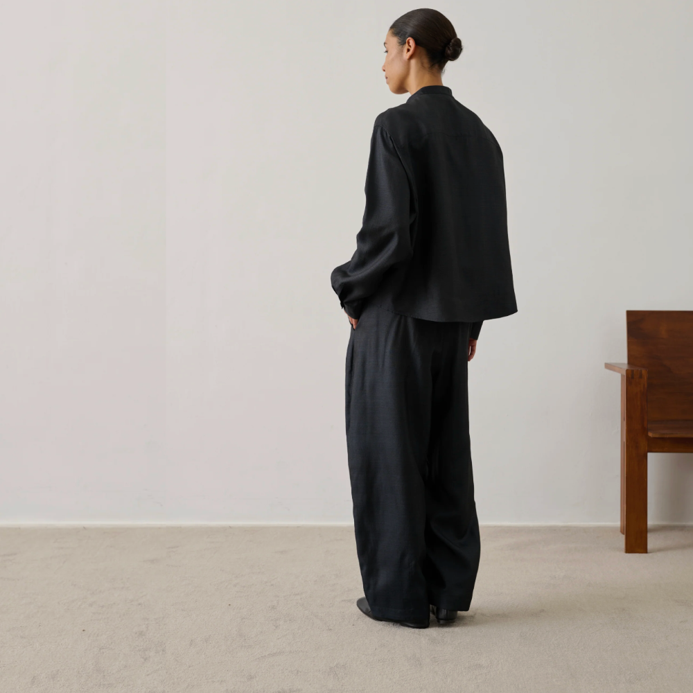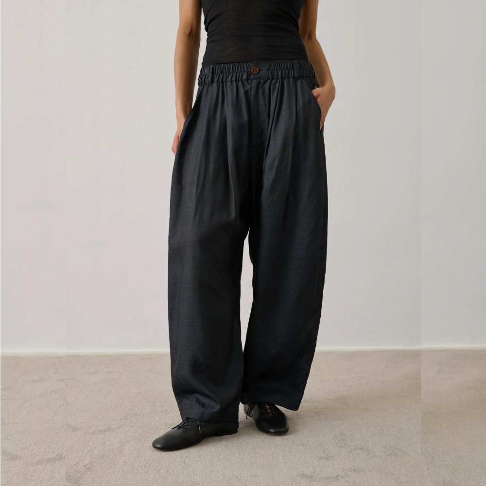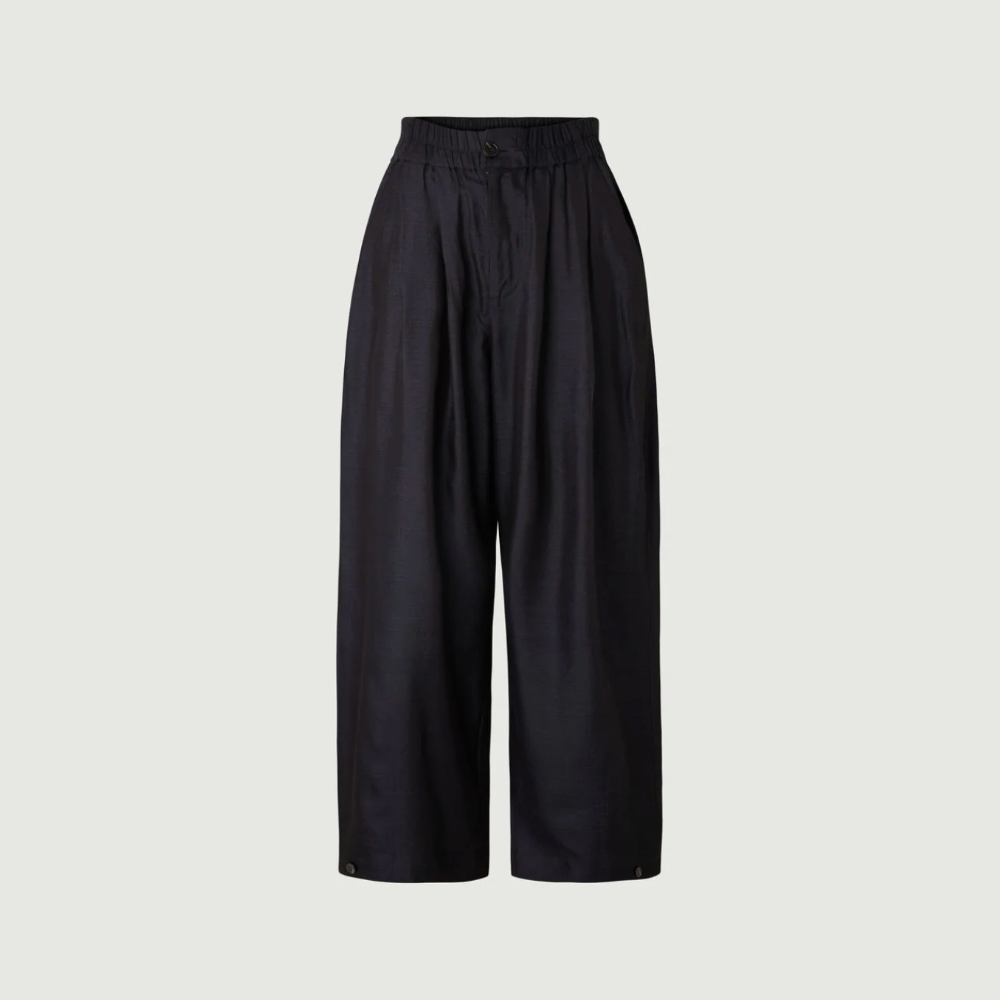 Relaxed fit with two pockets in the front and cropped leg with buttons to tighten the ankles.