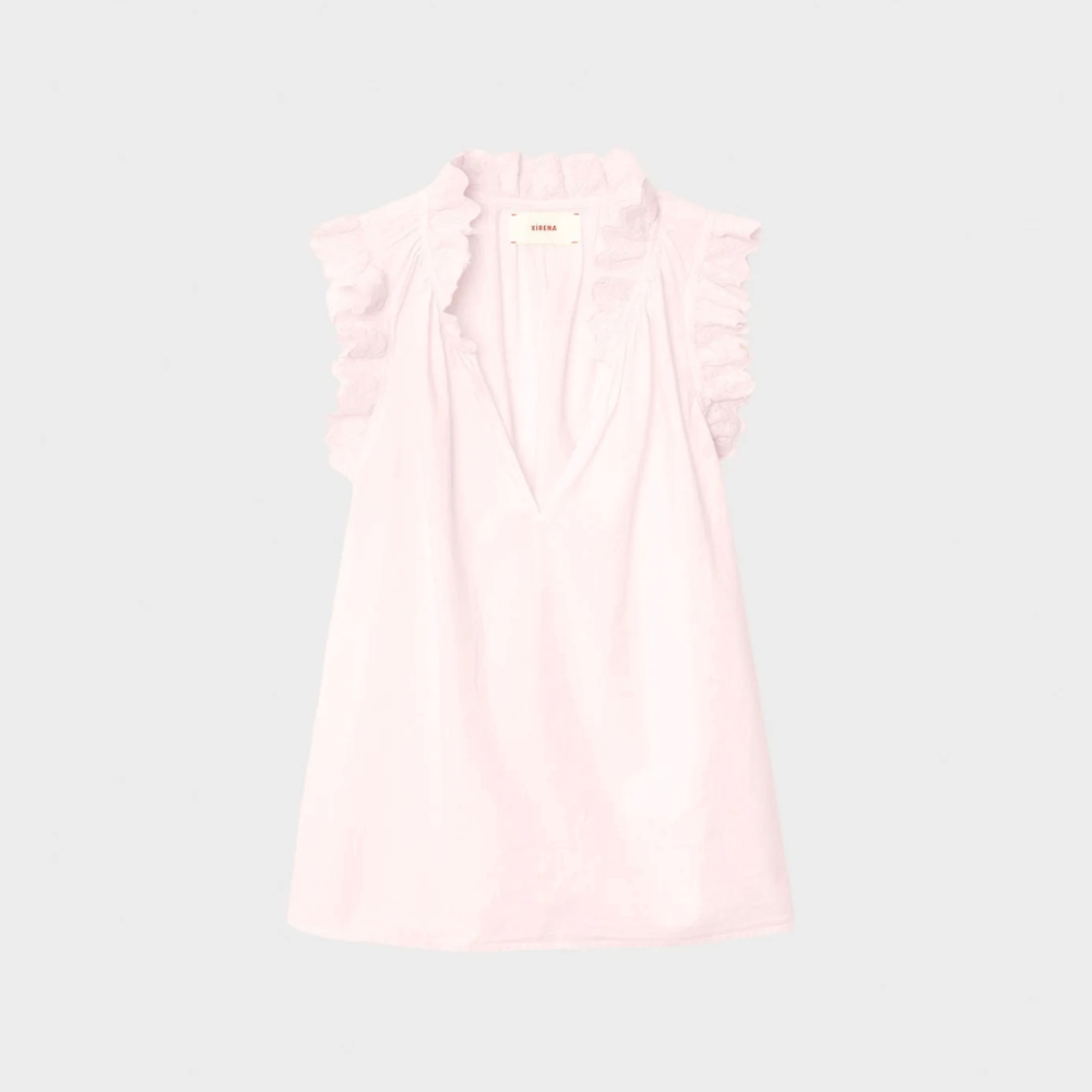 Sleeveless top with deep V-neck collar and decorative ruffles on shoulders and collar.