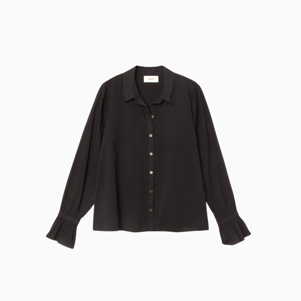 Made in soft cotton, Sybil features a classic collar, a buttoned closure and elasticated wrists creating ruffled cuffs.