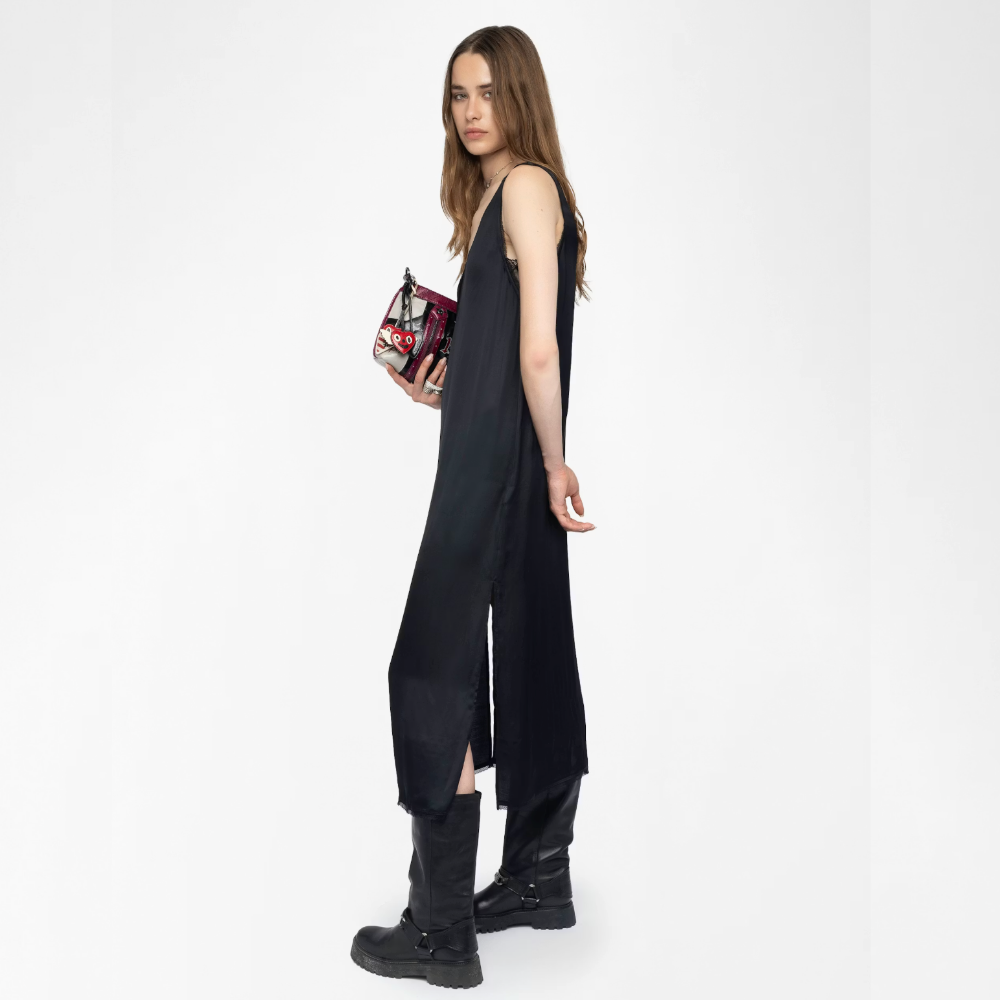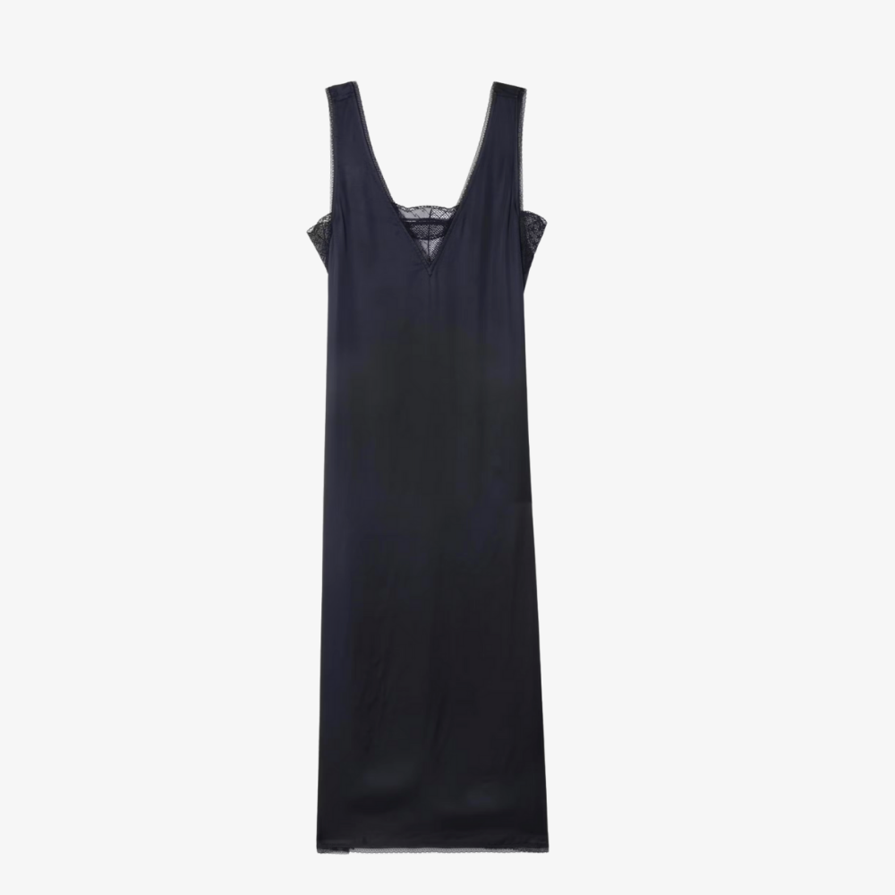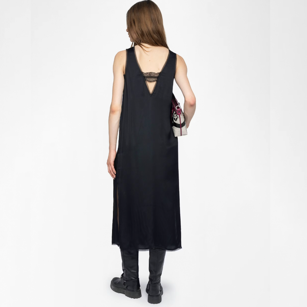 Sleeveless slip dress with deep V-neck and delicate black lace trim around hems.