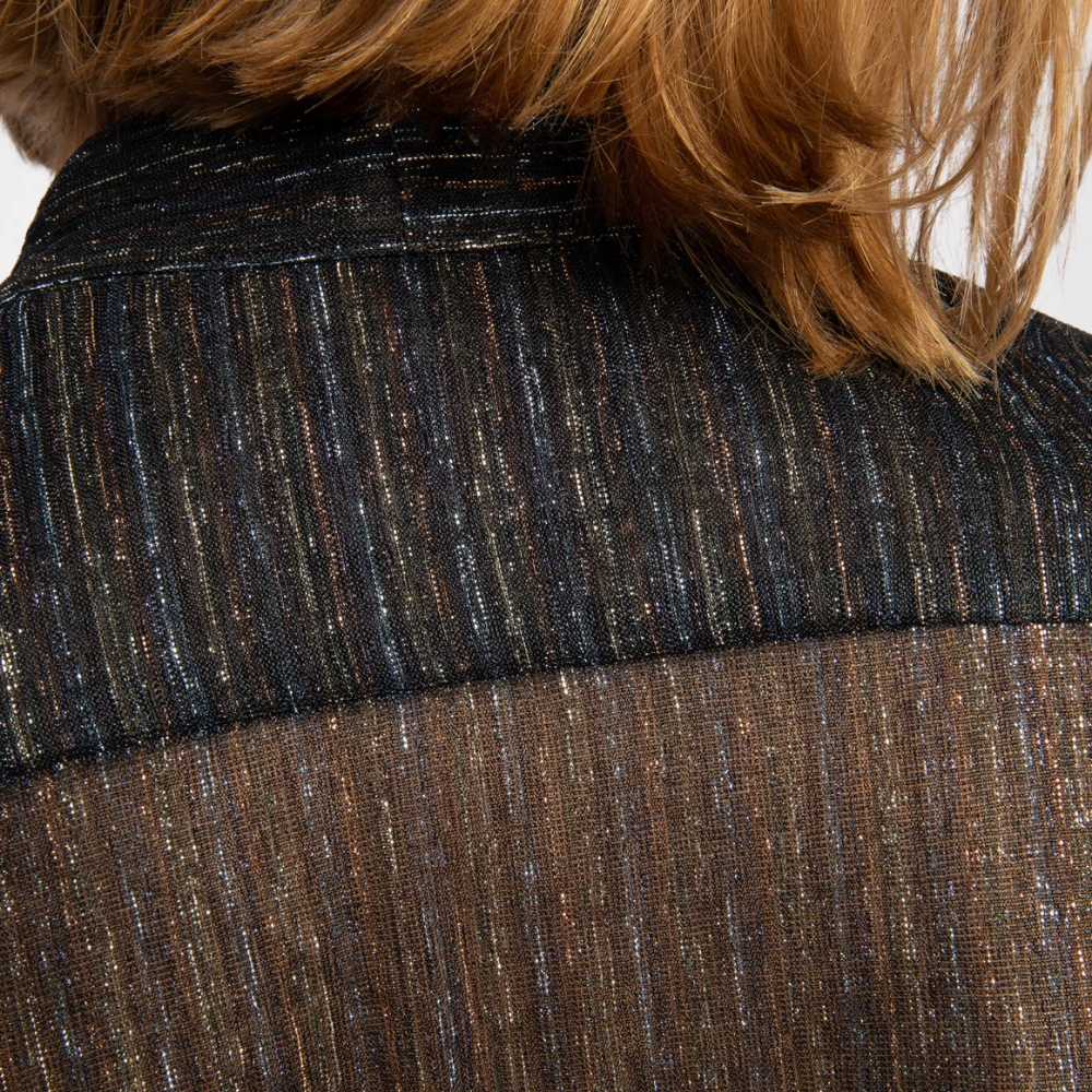 Shimmer chiffon shirt with pussy-bow collar, wings embroidery on the back and button closure.