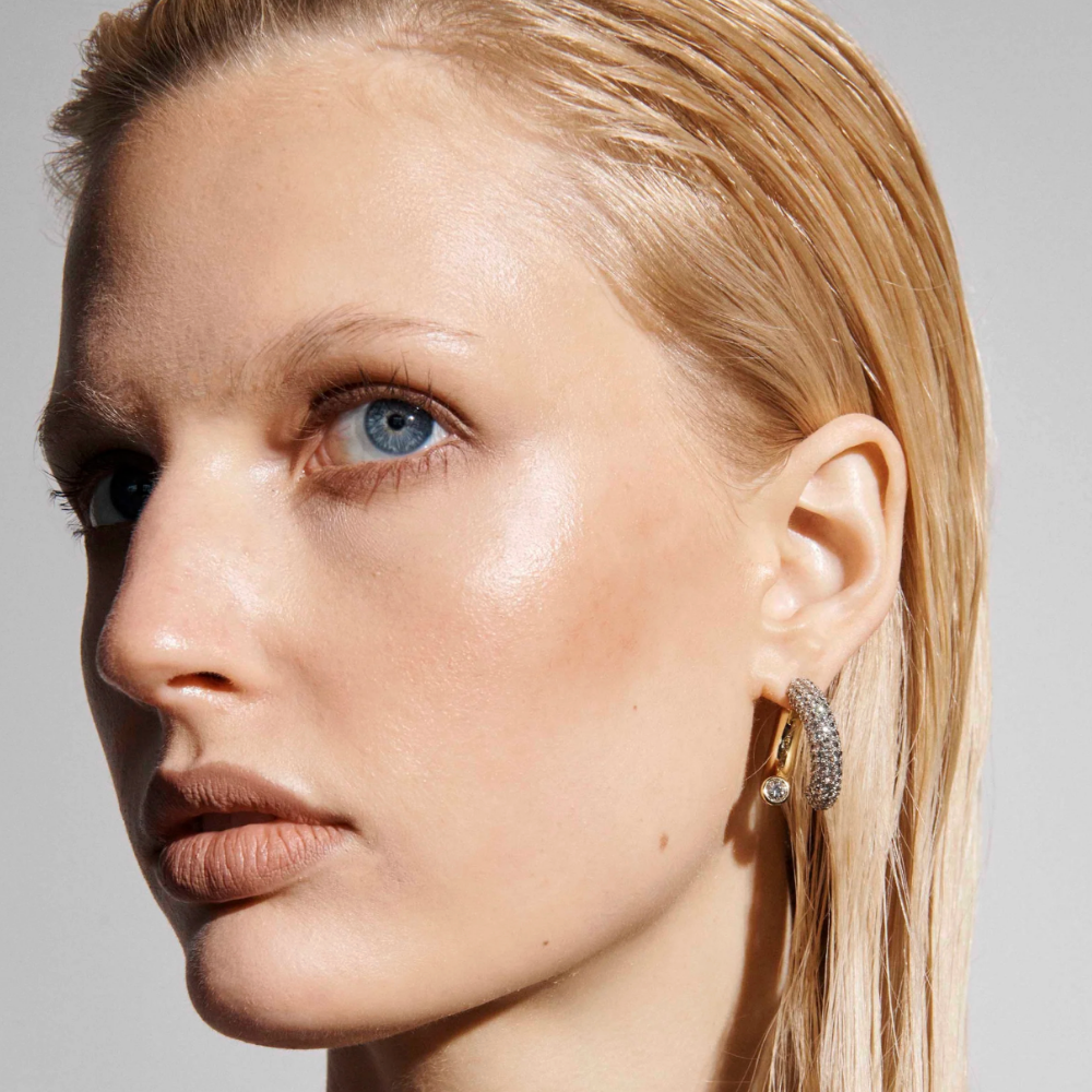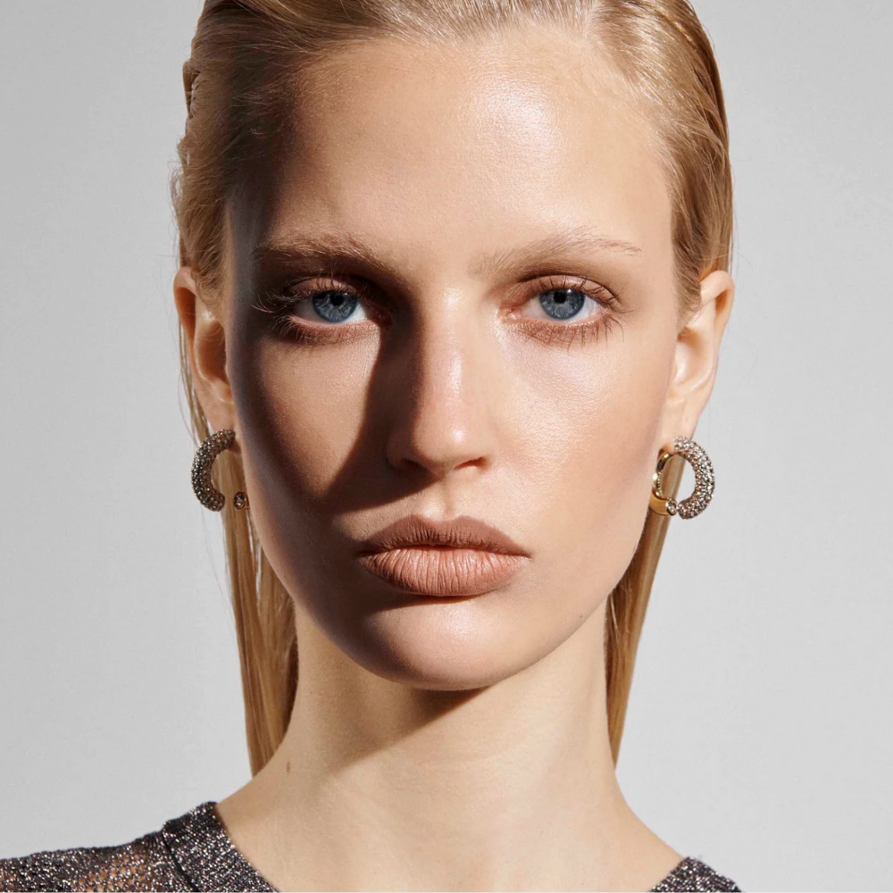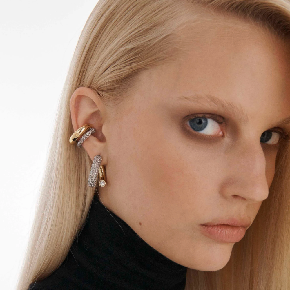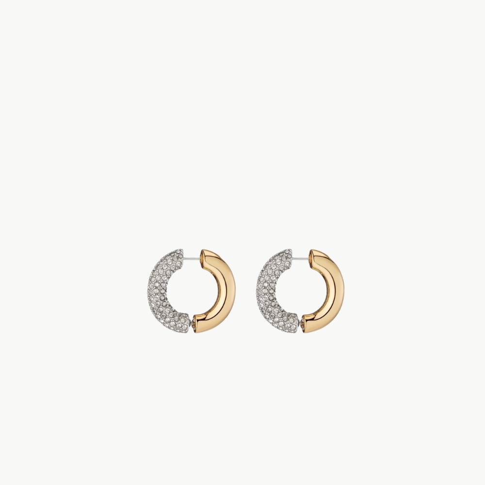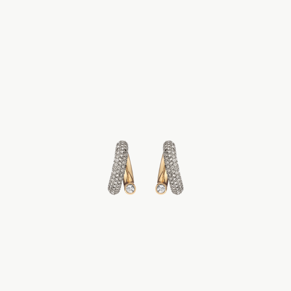 The Monroe earrings reinterpret the classic hoops with a contemporary design.Made of gold plated brass and crystals, this sculptural earring can be worn with the pavé crystals in the front or the back, for a day & night look.Featuring a signature logo engraving on the golden section. Hypoallergenic steel post.