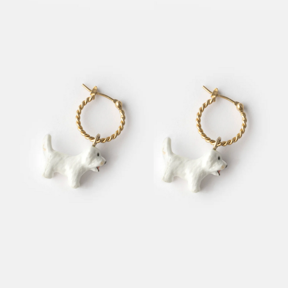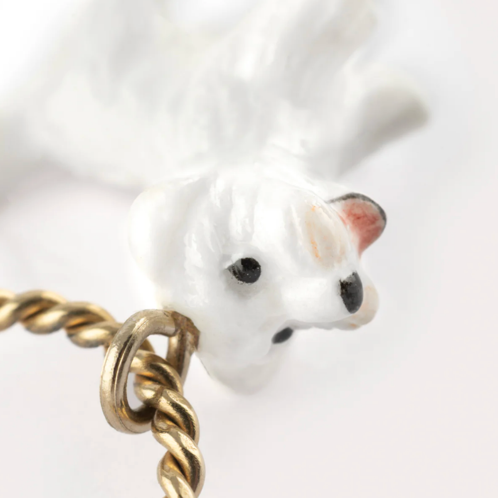 Brass with gold plating with a small porcelain dangling white dog.2.5 cm length