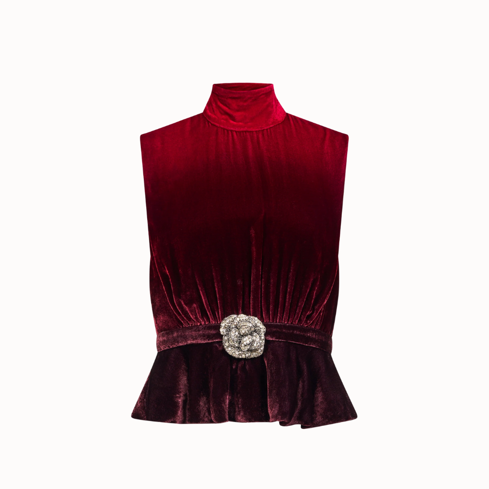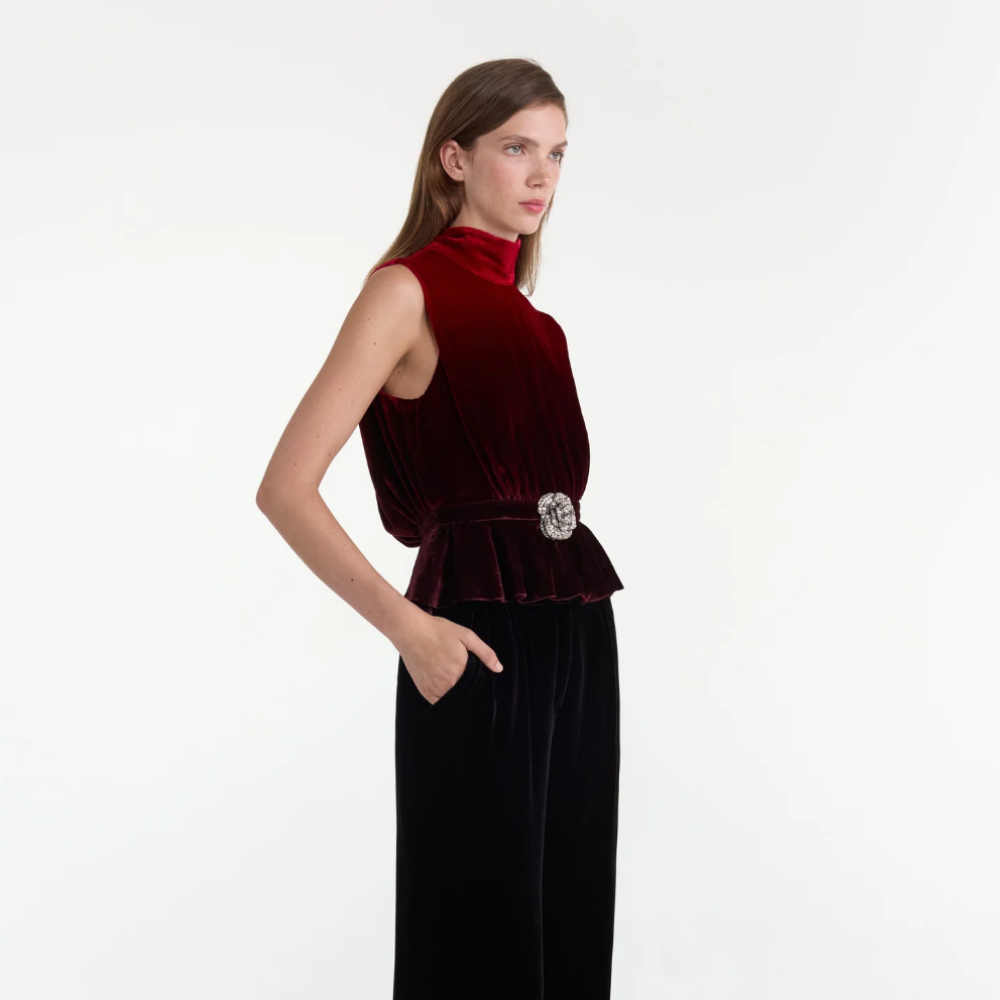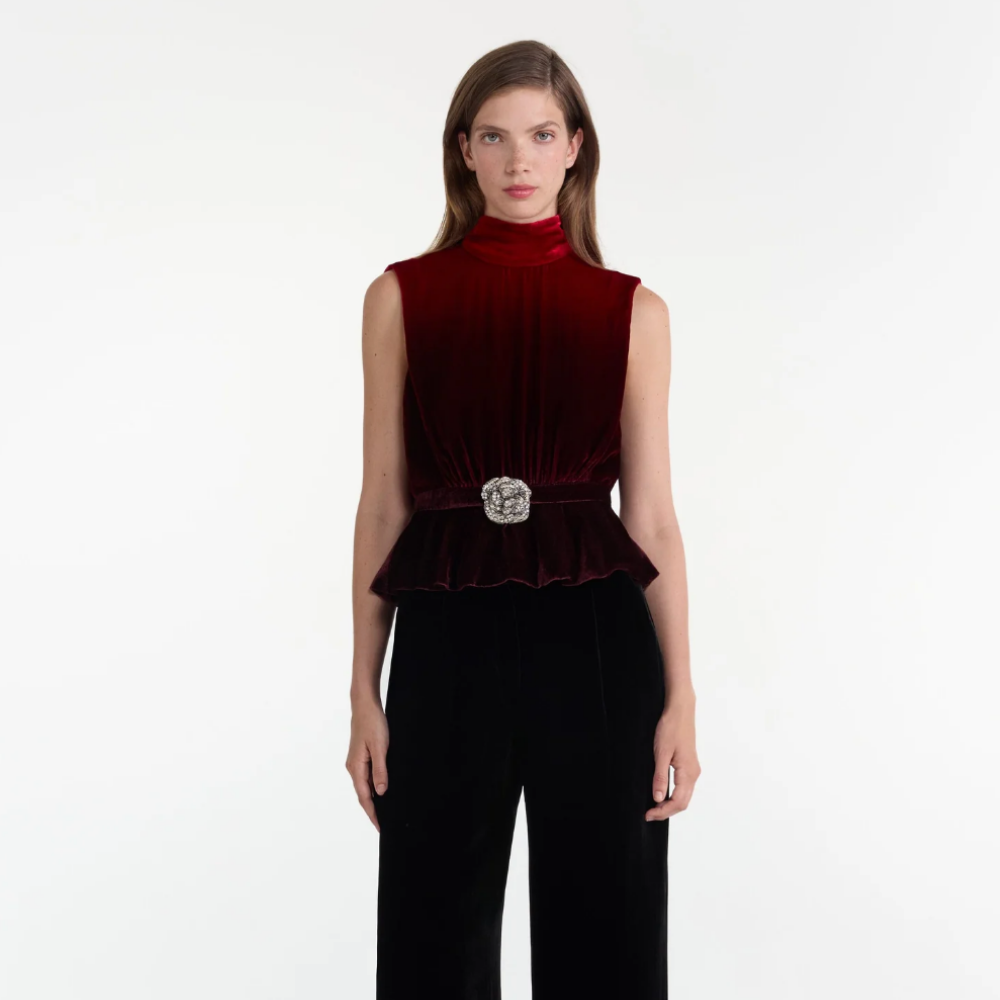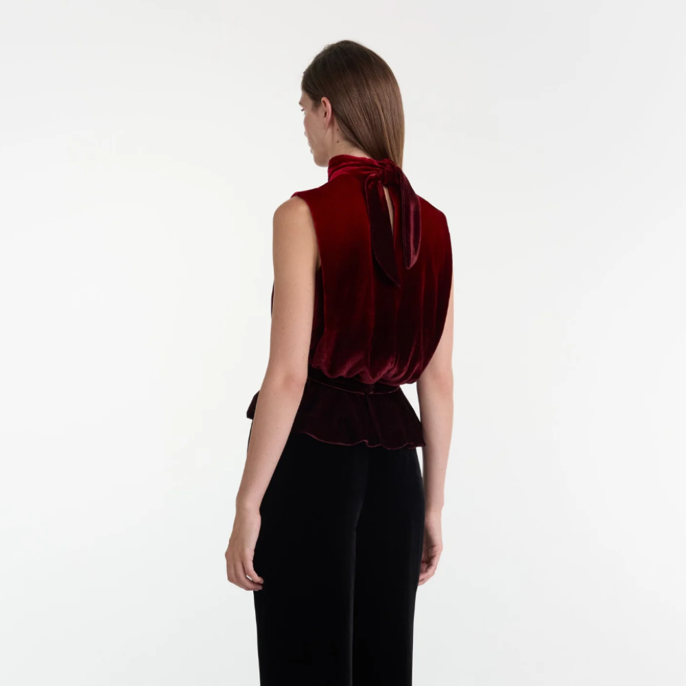 This sleeveless top is a reinterpretation on the Saloni Fleur Dress, and features a soft shoulder fold, a back neck tie, and a waistband with a soft peplum.