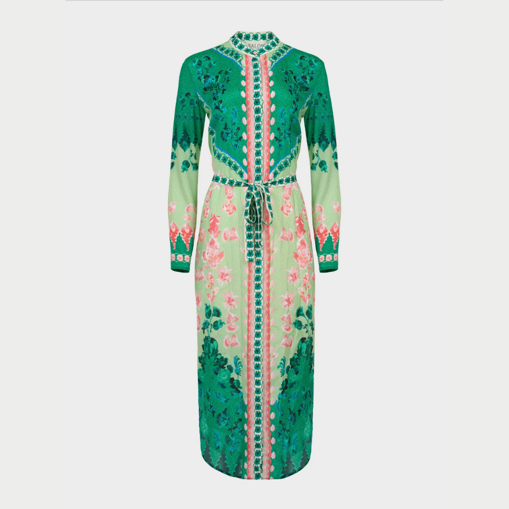 Molly-D dress in pastel green terrazzo base with a soft graphic print, framed by verdant colour blocks.