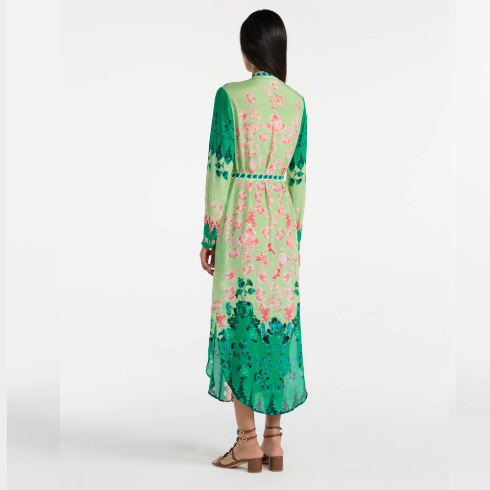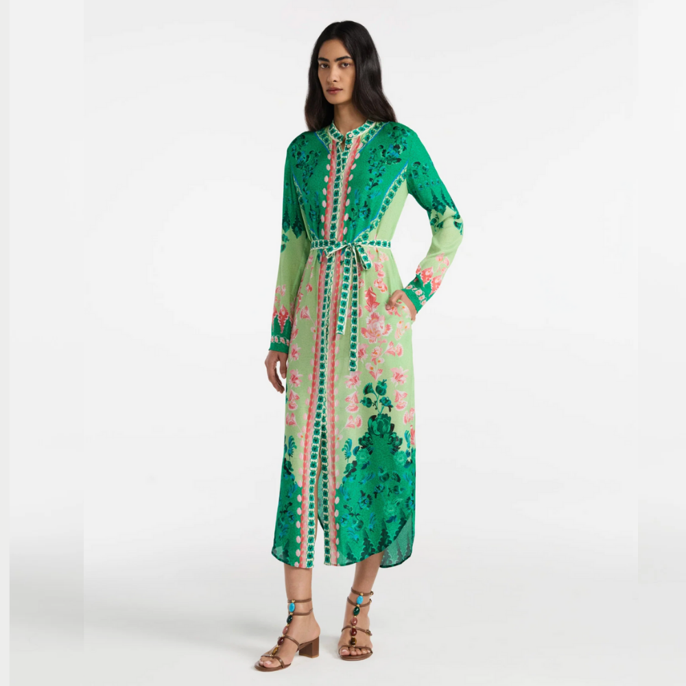 This dress comes with a contrast belt in the same fabric and has a fluid skirt silhouette with minimal side slits for a flattering and elegant effect.