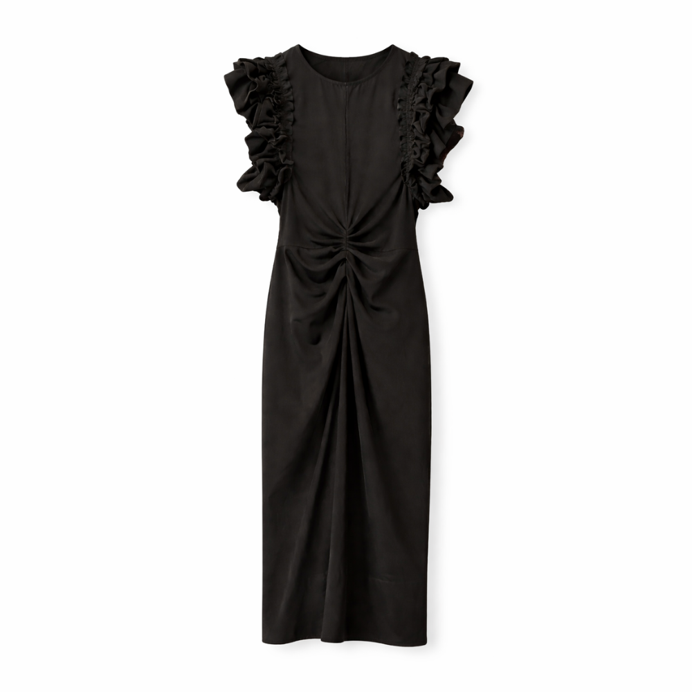 Midi length dress featuring a round neck and feminine flutter sleeves with ruffles.