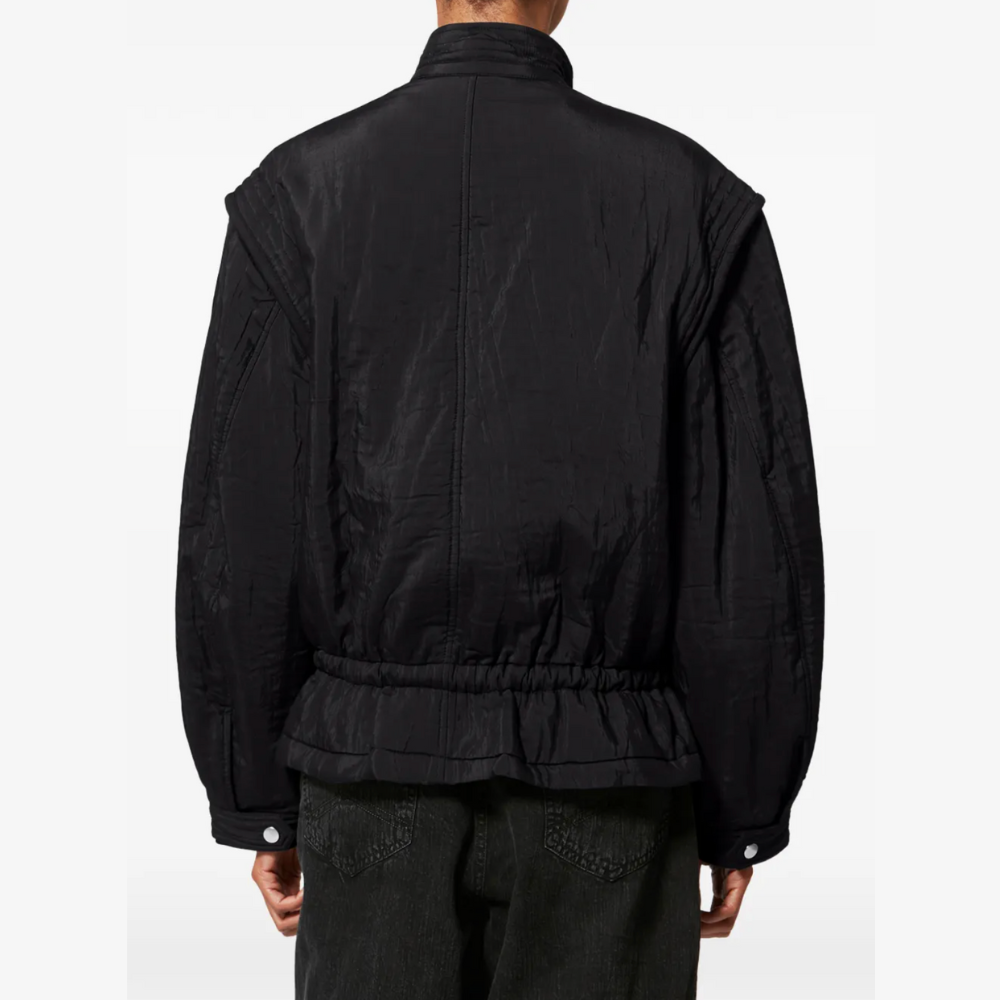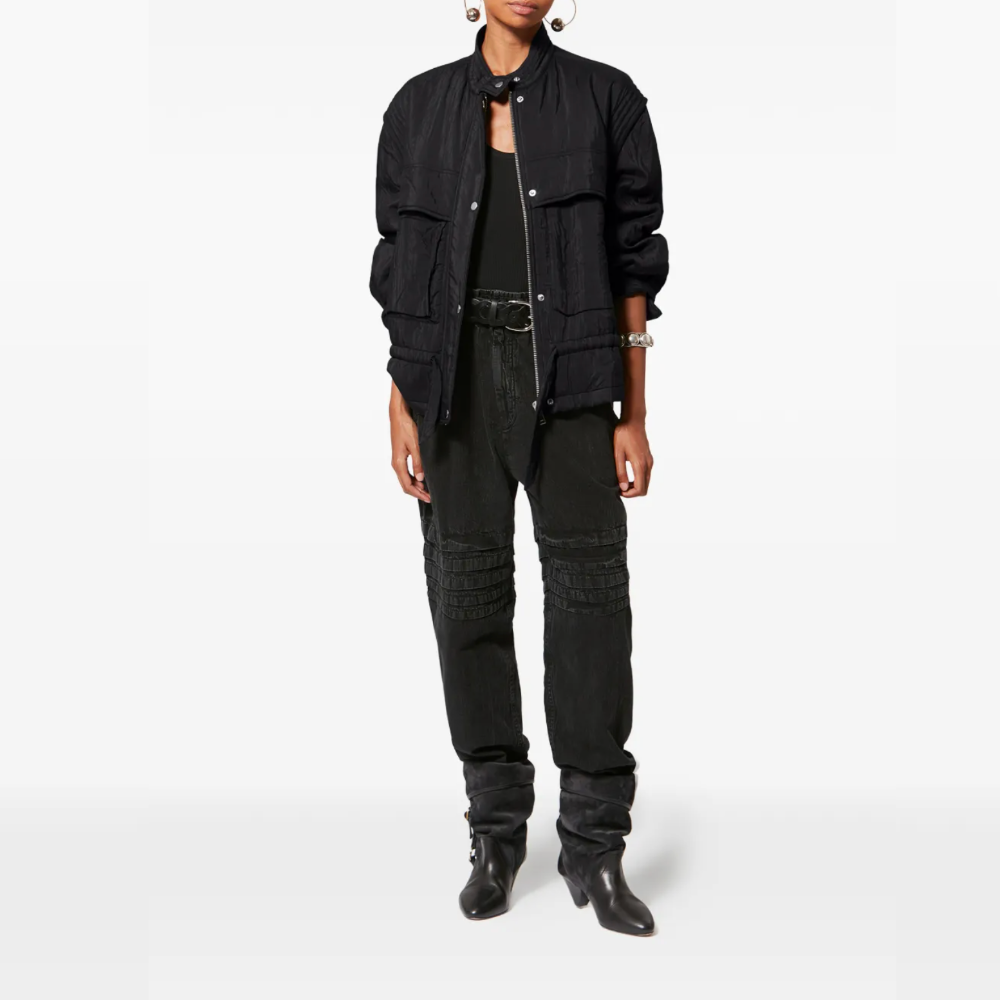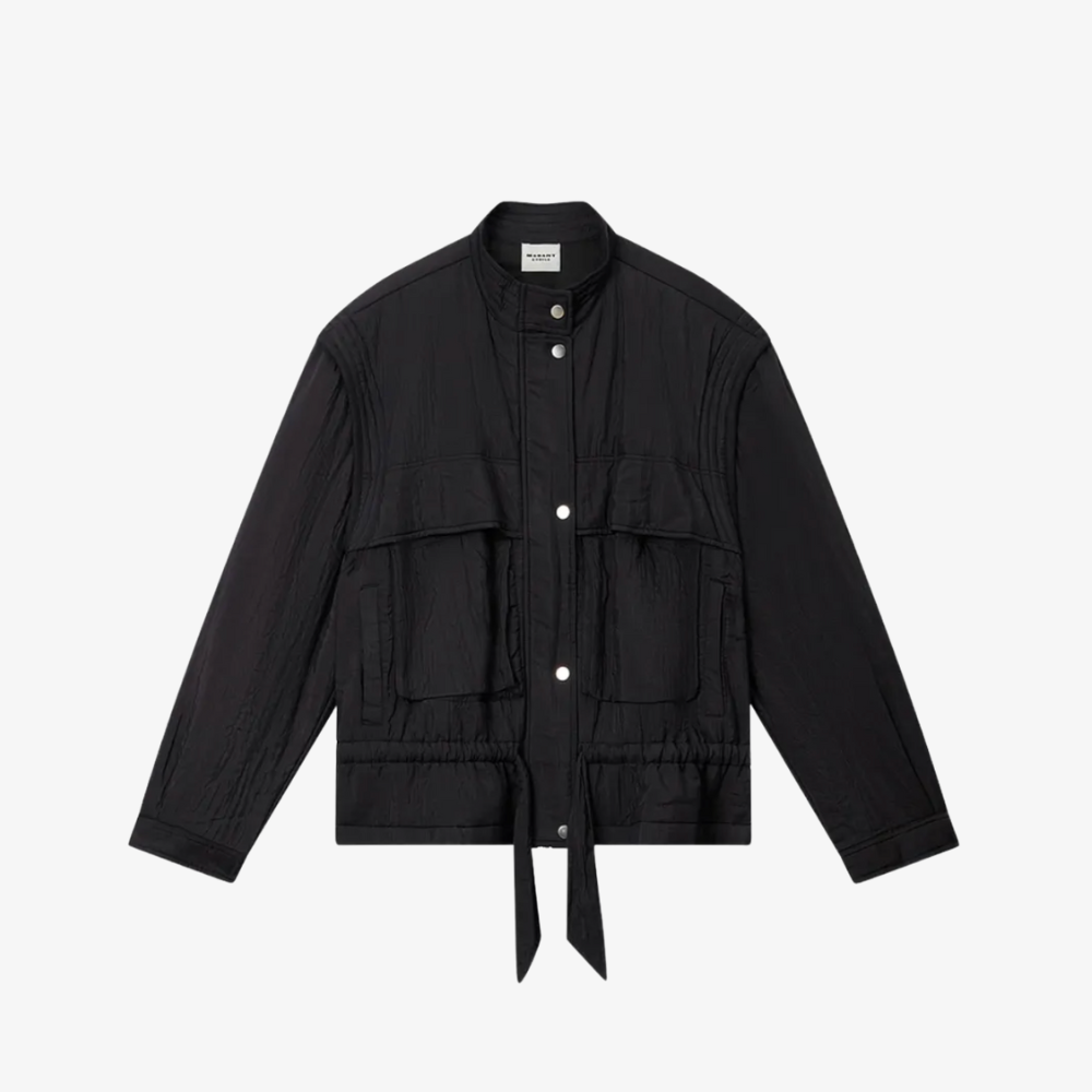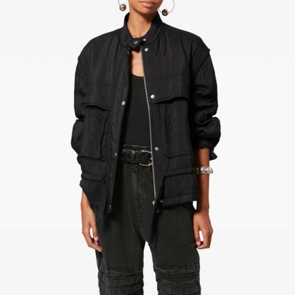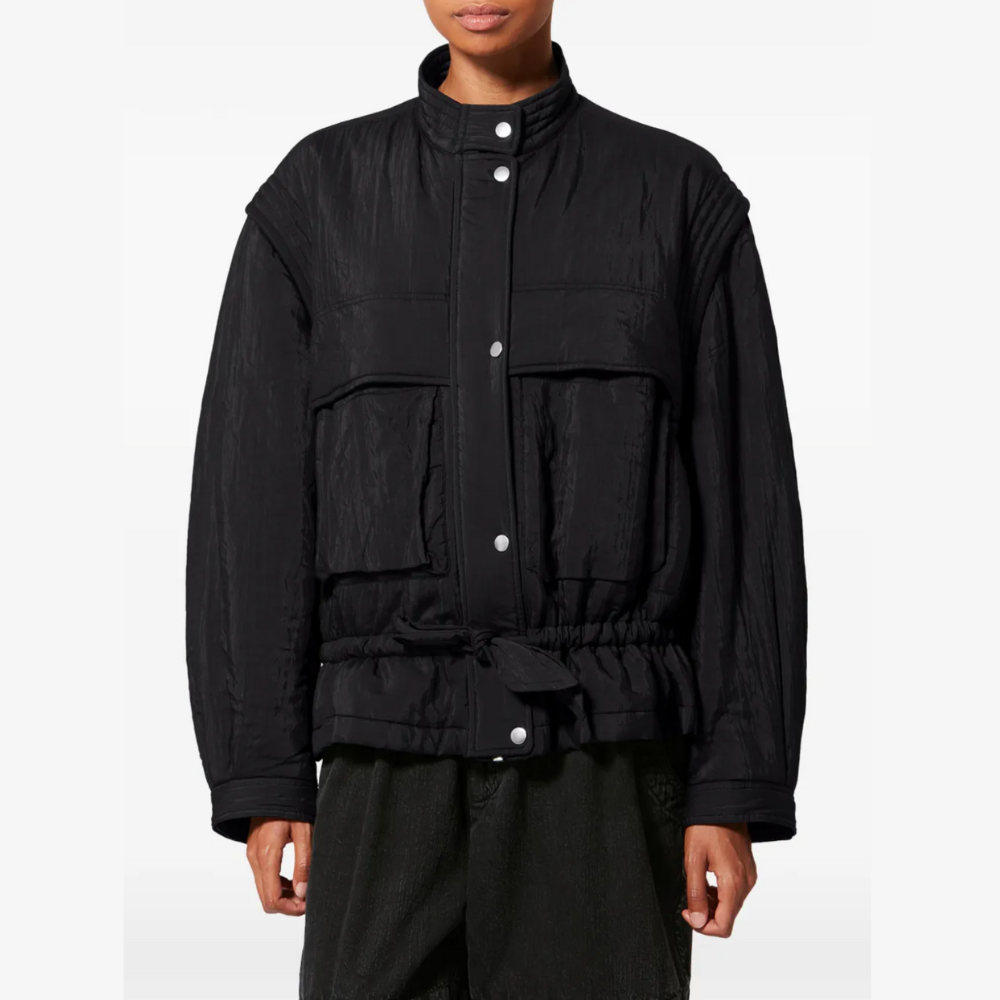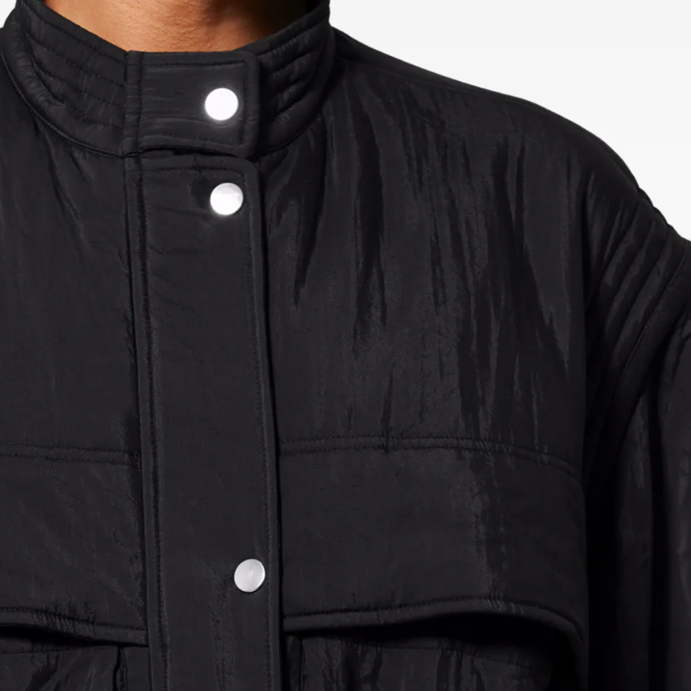 Deep patch pockets on the chest and voluminous sleeves with buttoned wrists.