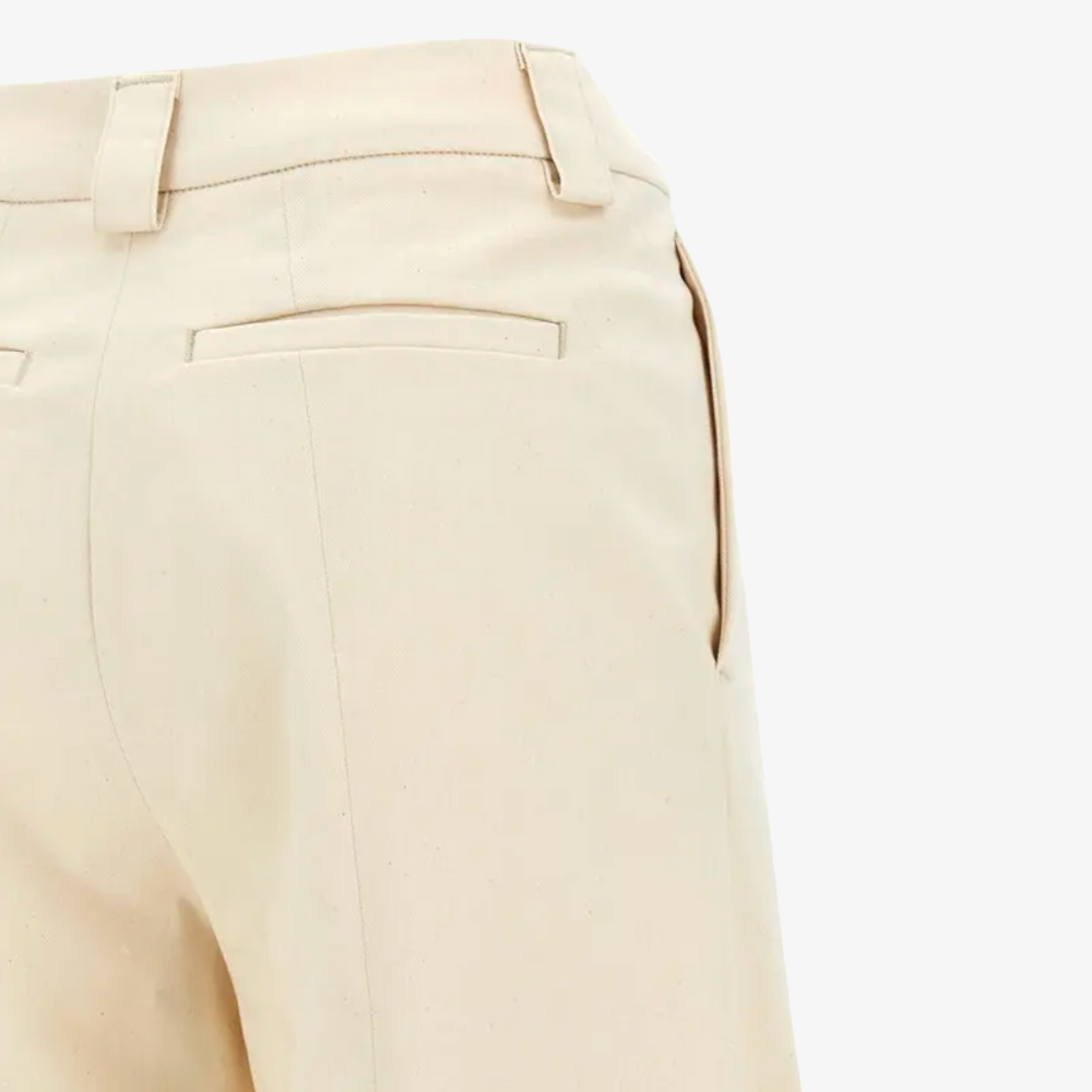 Concealed front fastening and wide belt loops, two side slit pocket and two rear welt pockets.