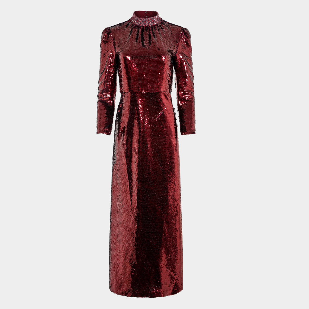 Full length all-over sequin dress with a high neckband hand-embroidered with beads and crystals.