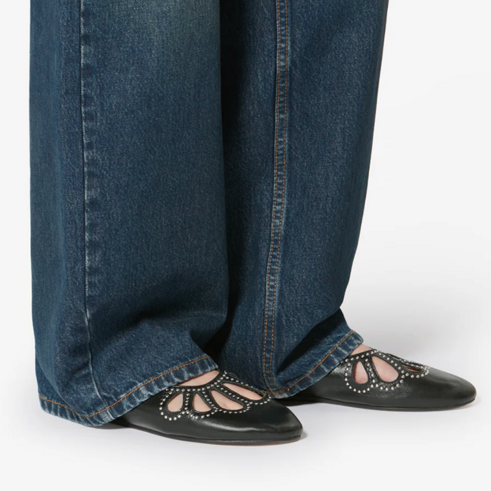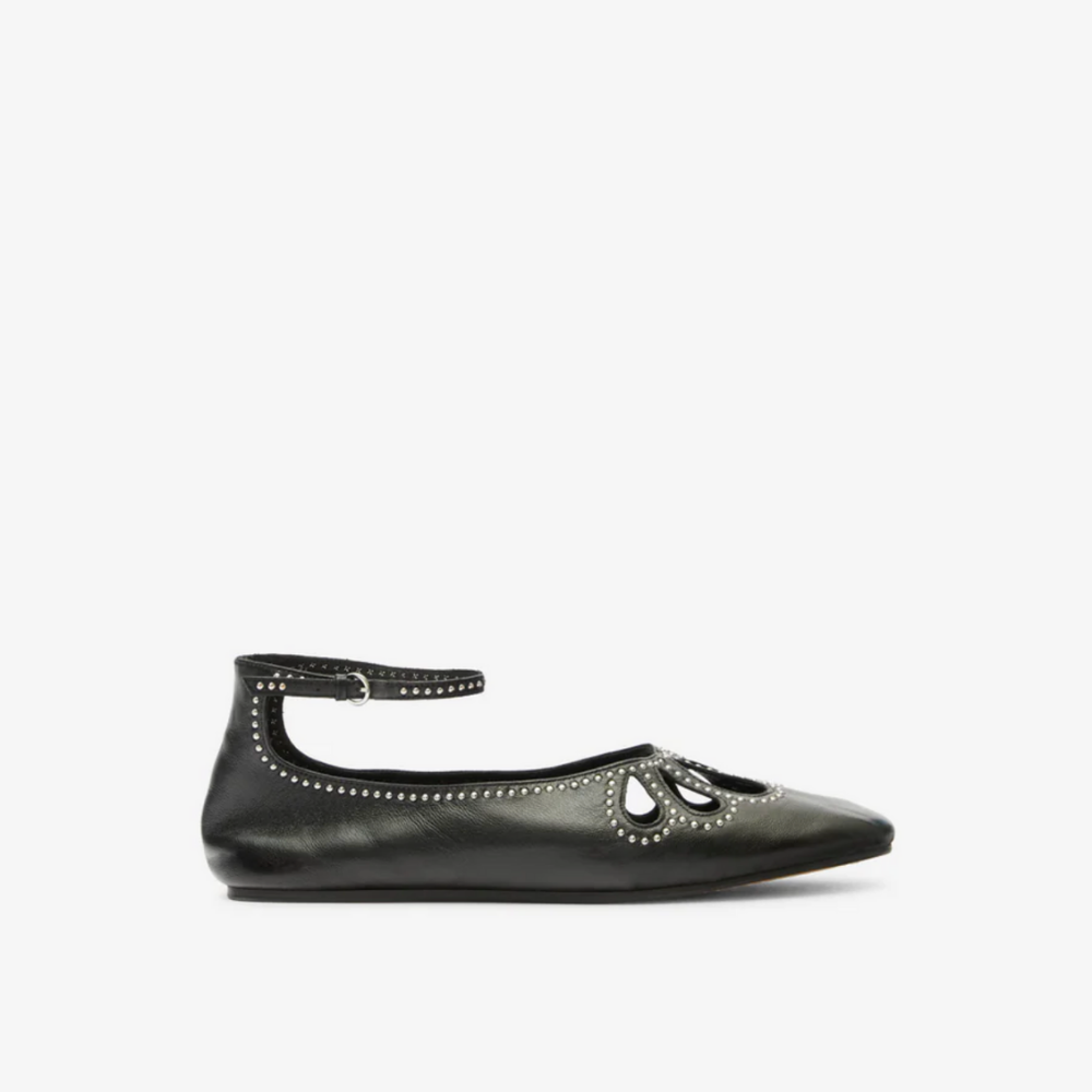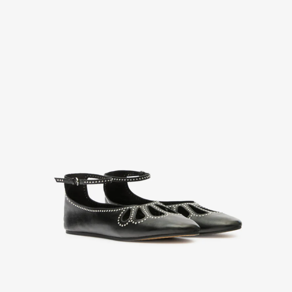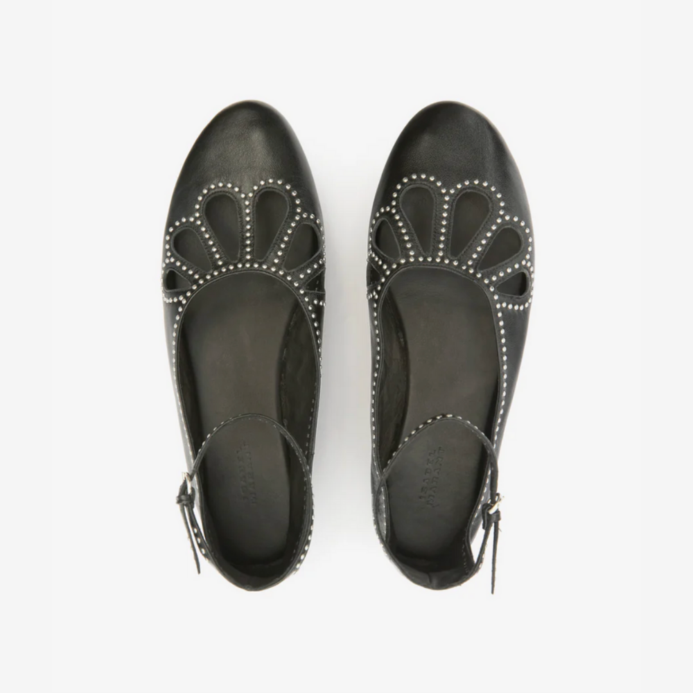 Isabel Marant Bloris flat shoes in soft black leather with silver studs creating a motif on the point of the shoe.