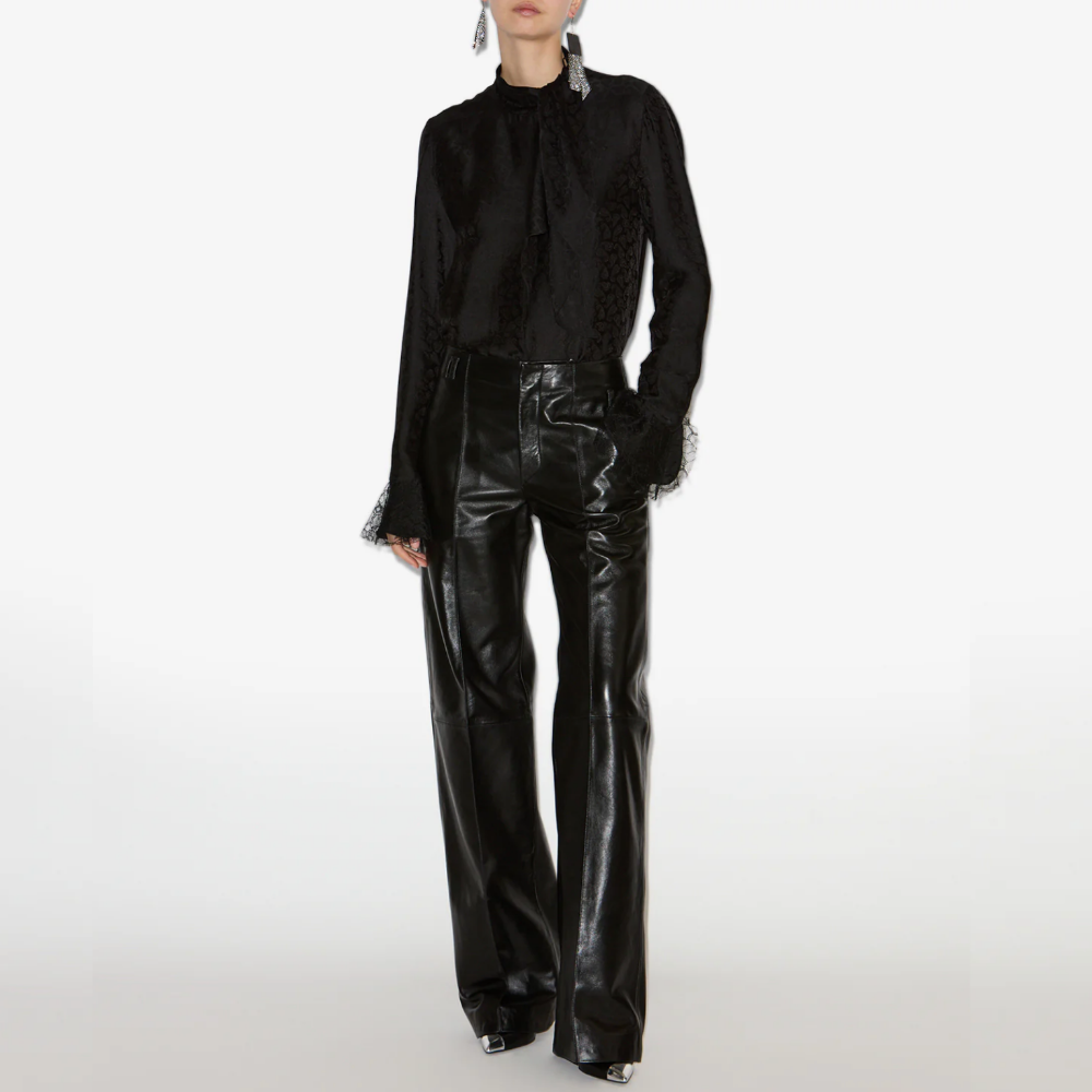 Long sleeves cuffed with delicate lace, high side buttoned neck with tie scarf-like stand-up collar.