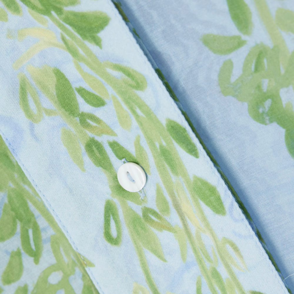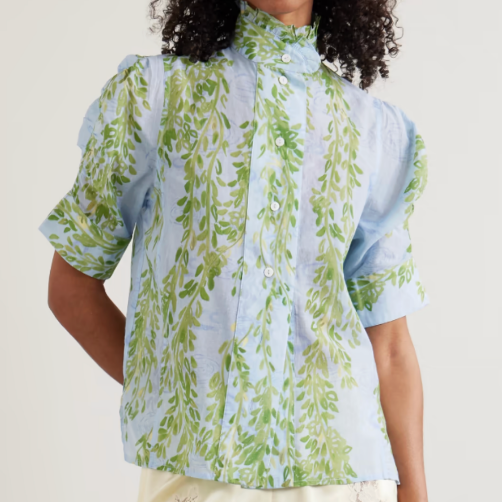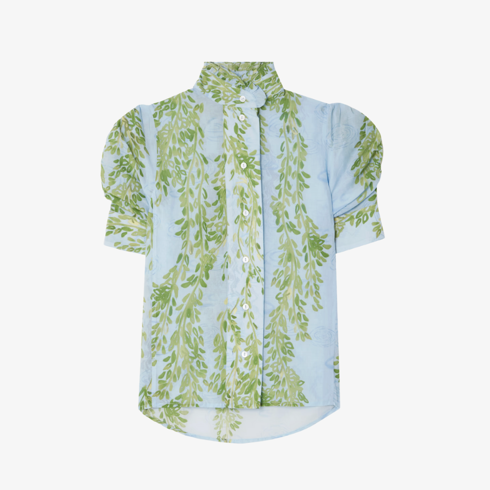 Featuring a frilled high collar, Gigot short sleeves & full button closure.