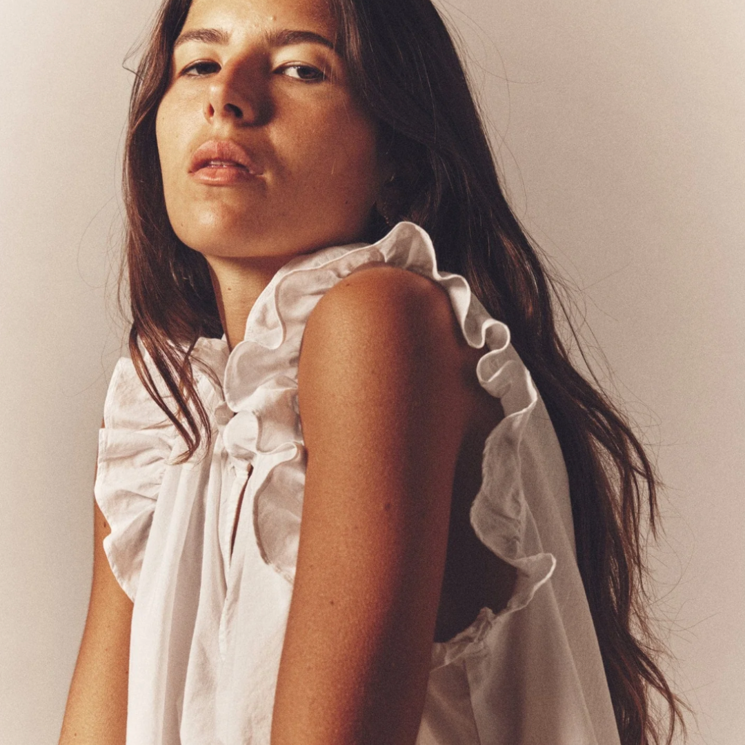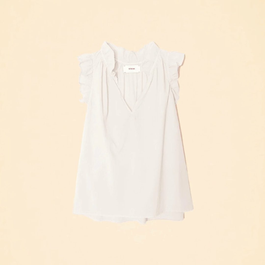 Sleeveless top with deep V-neck collar and decorative ruffles on shoulders and collar.