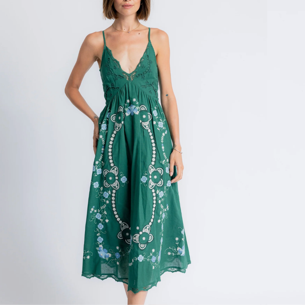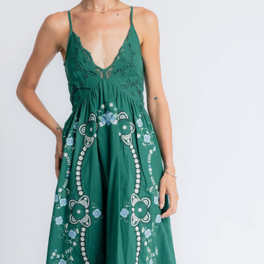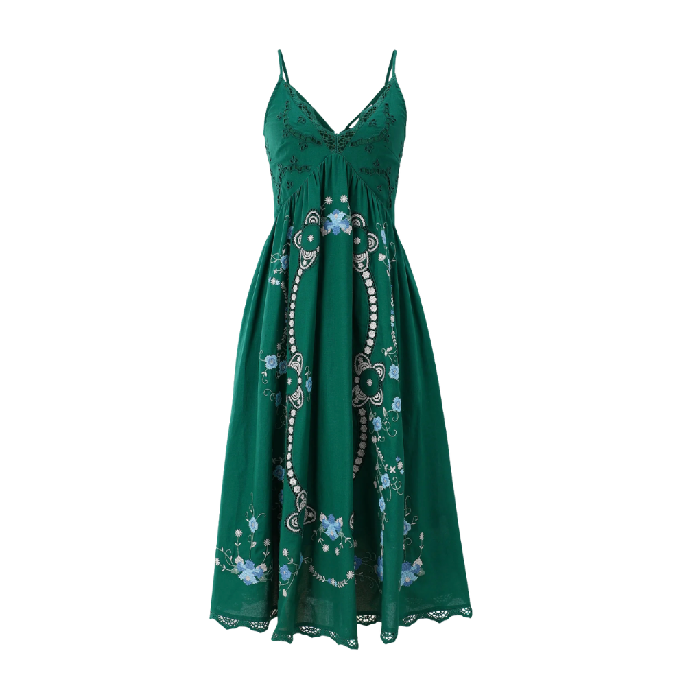 Ankle length dress with beautiful flower embroidery on the skirt, adjustable spaghetti straps and fitted bodice with broderie anglaise detailing on the chest and rear zip closure.