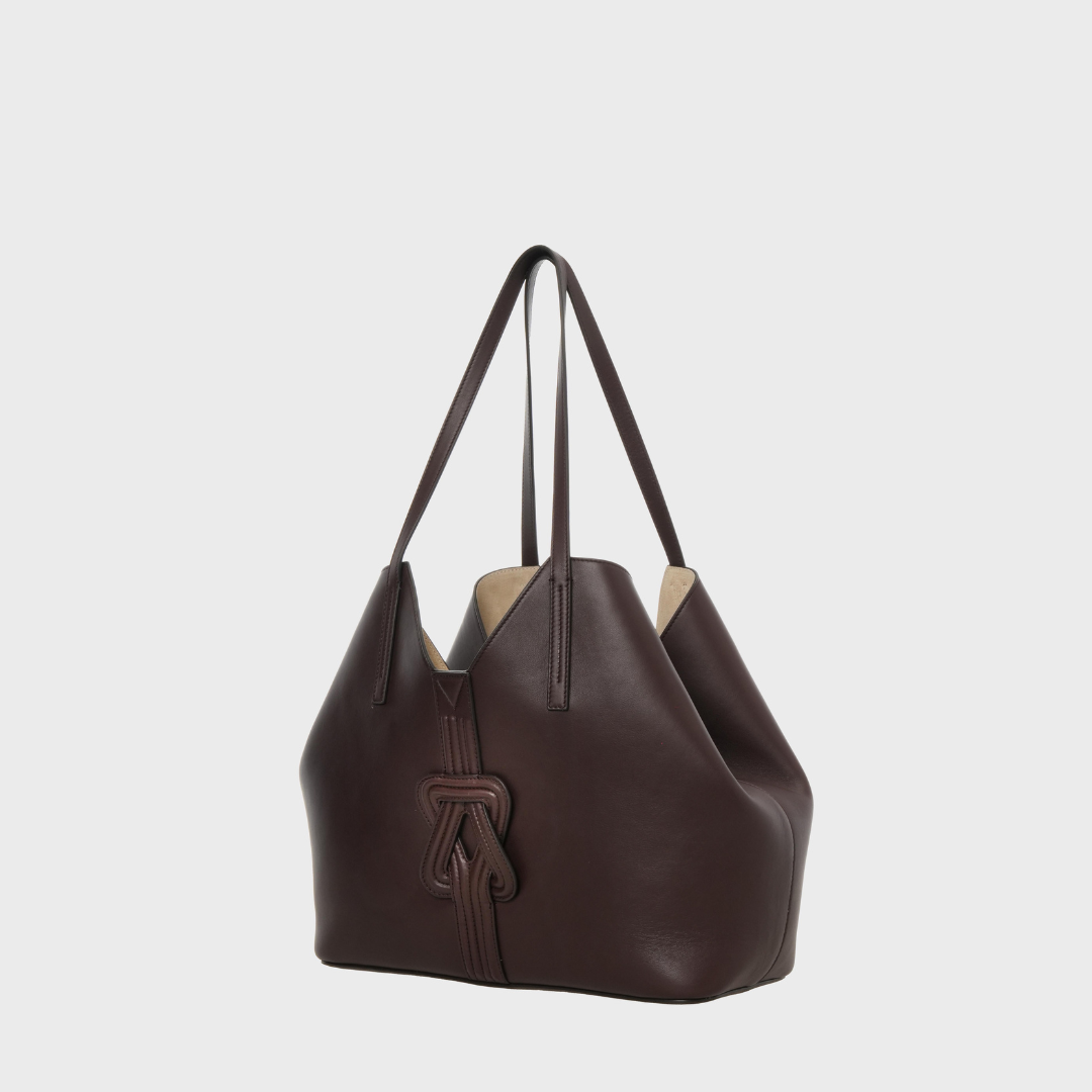 Luxurious tote bag with narrow shoulder straps, intricate knot embellishment on the front and small logo embossed in gold.