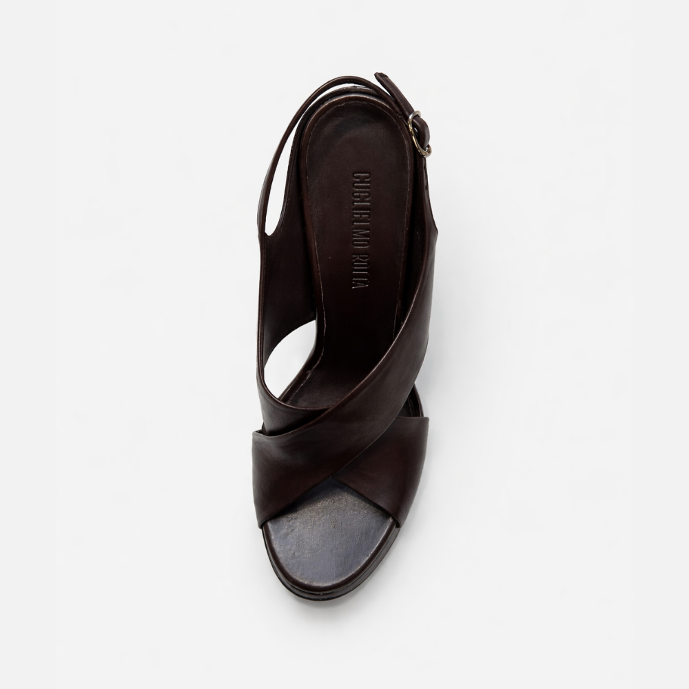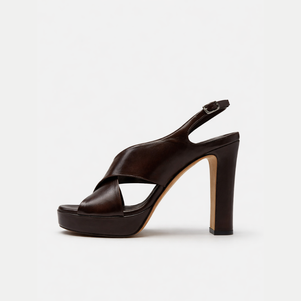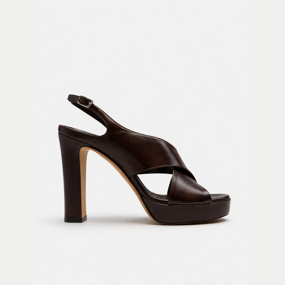 Platform sandals with chunky block heel and leather sole. Rounded toe and crossed straps on the neck of the foot and little buckle on the back to regulate the length of the back strap.