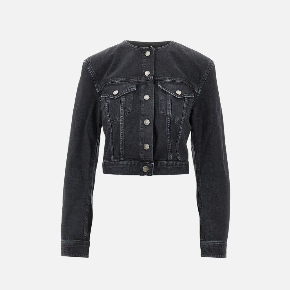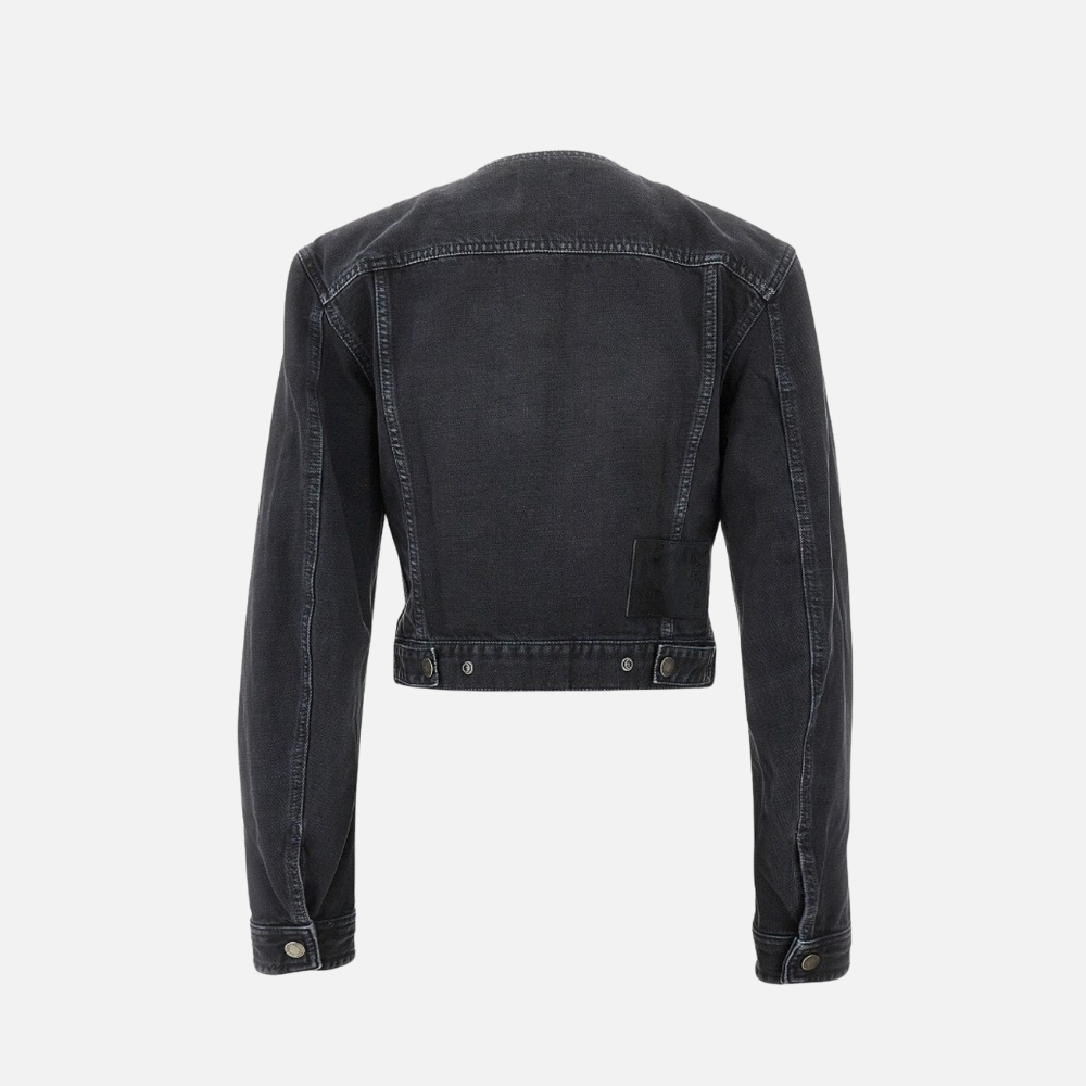 Collarless jacket with a fitted cropped waist and padded shoulders, cut from non-stretch denim.