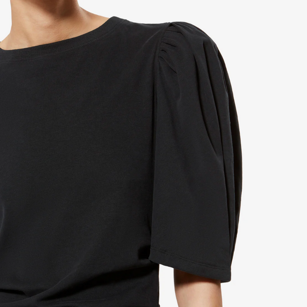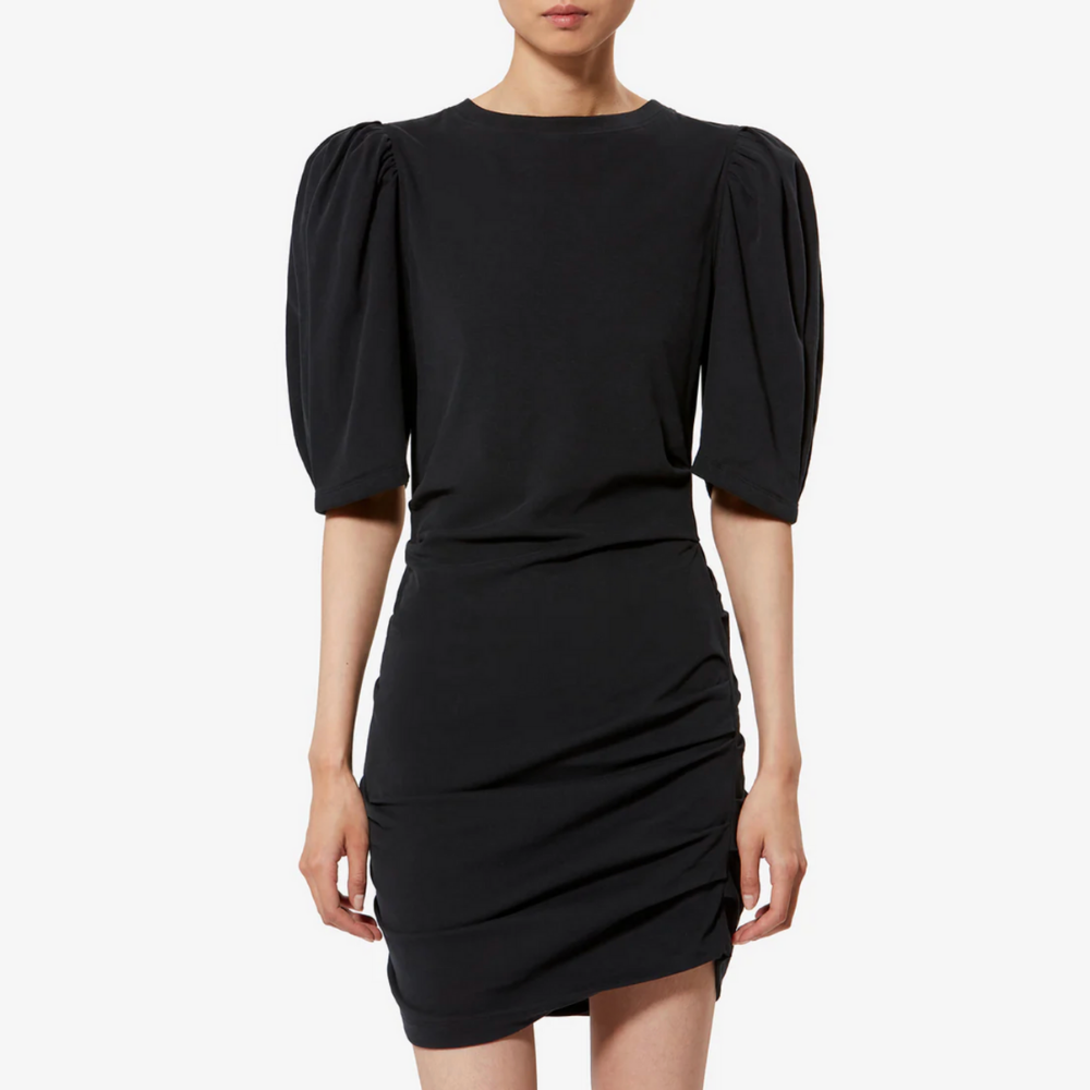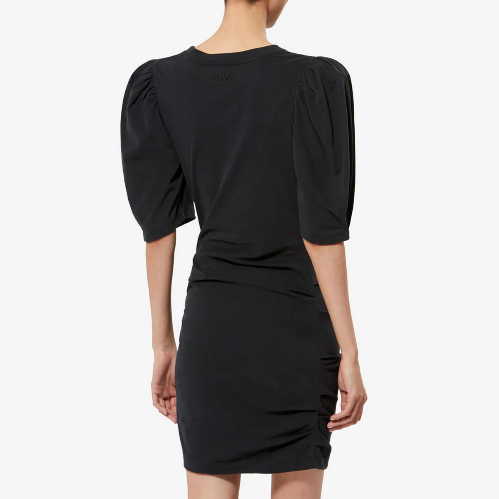 Stretchy cotton dress with round neck and short puffed sleeves.