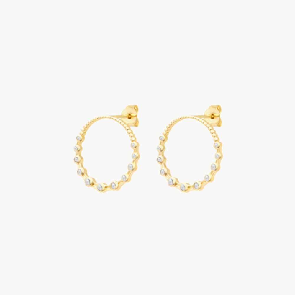 The Dalia Earrings are small circular studs encrusted with white zircons.
