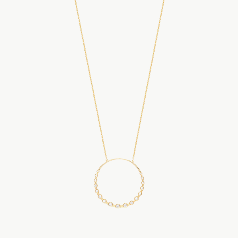 Delicate chain holding a fine hoop with white zircons in degrading size, perfect on its own or layered with other necklaces.