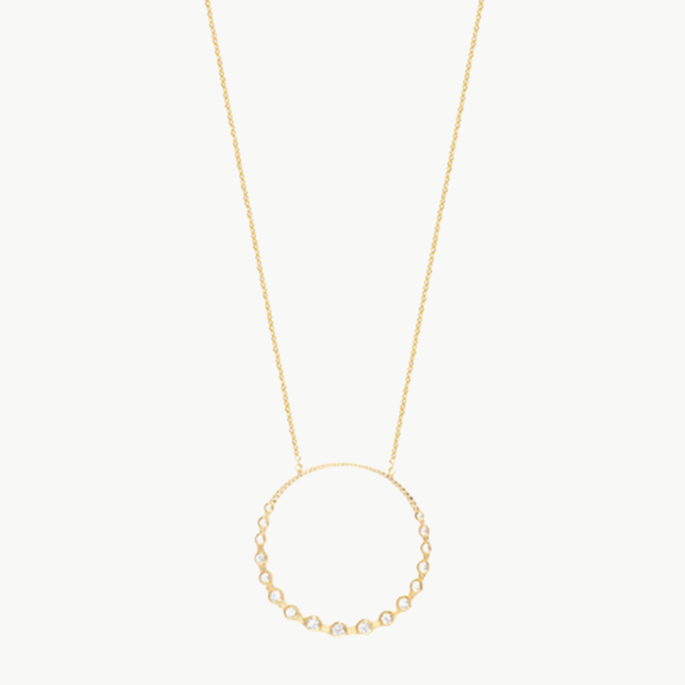 The Dalia Necklace featuring a circular pendant encrusted with white zircons.