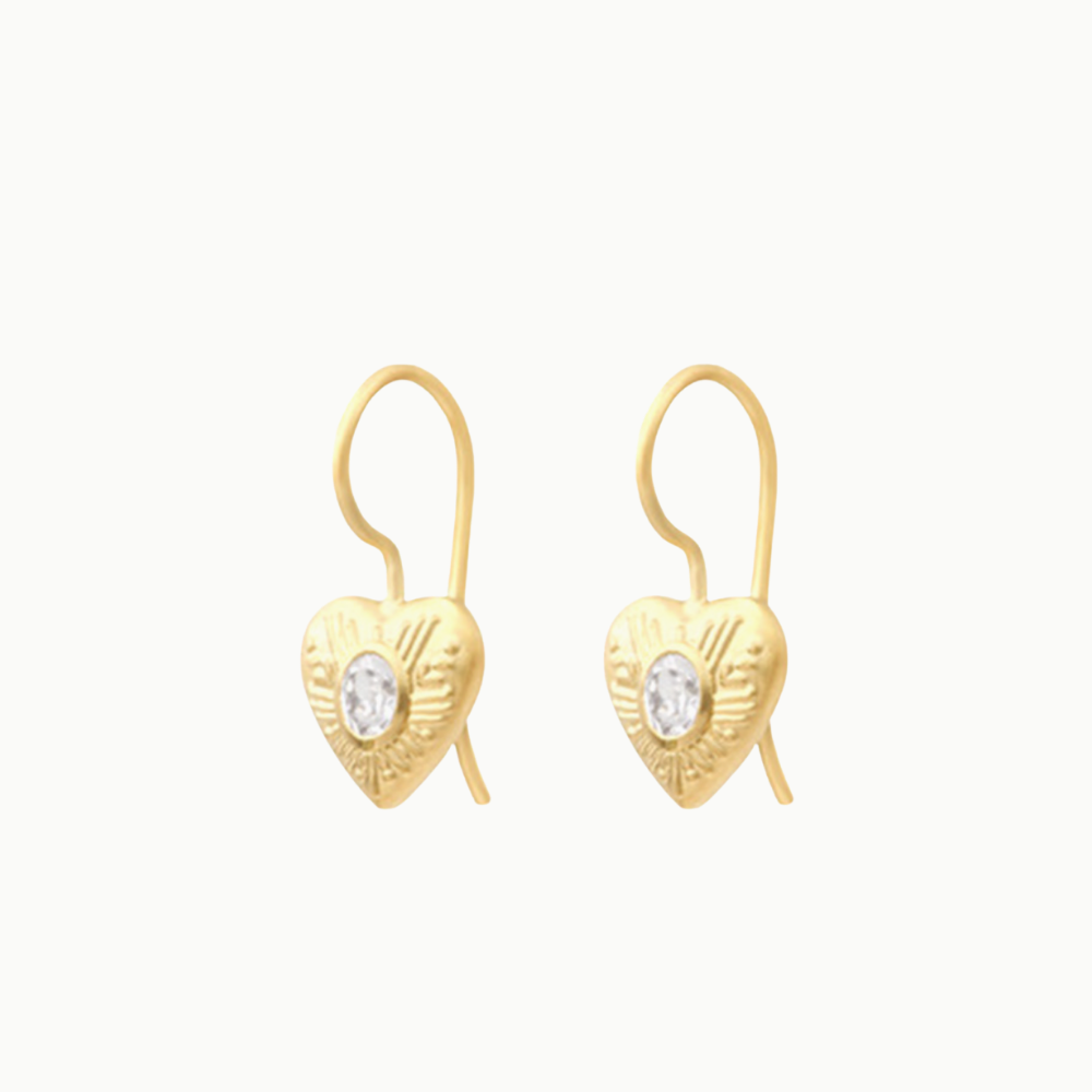 Sophisticated little hearts in brushed brass with a white zircon stone in the centre.