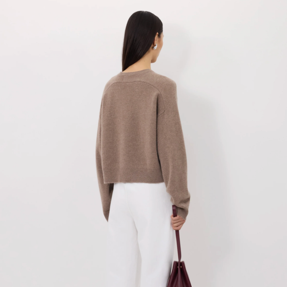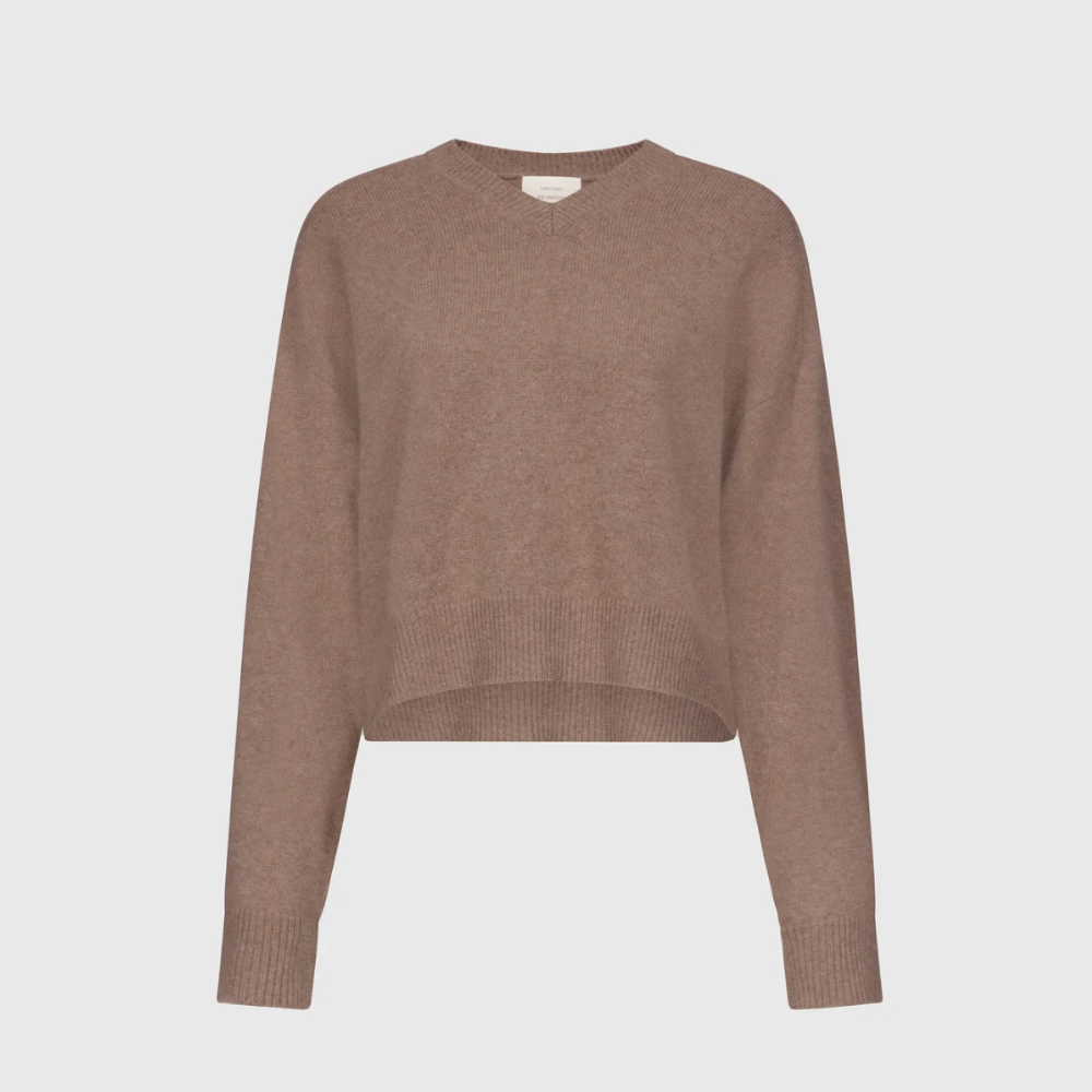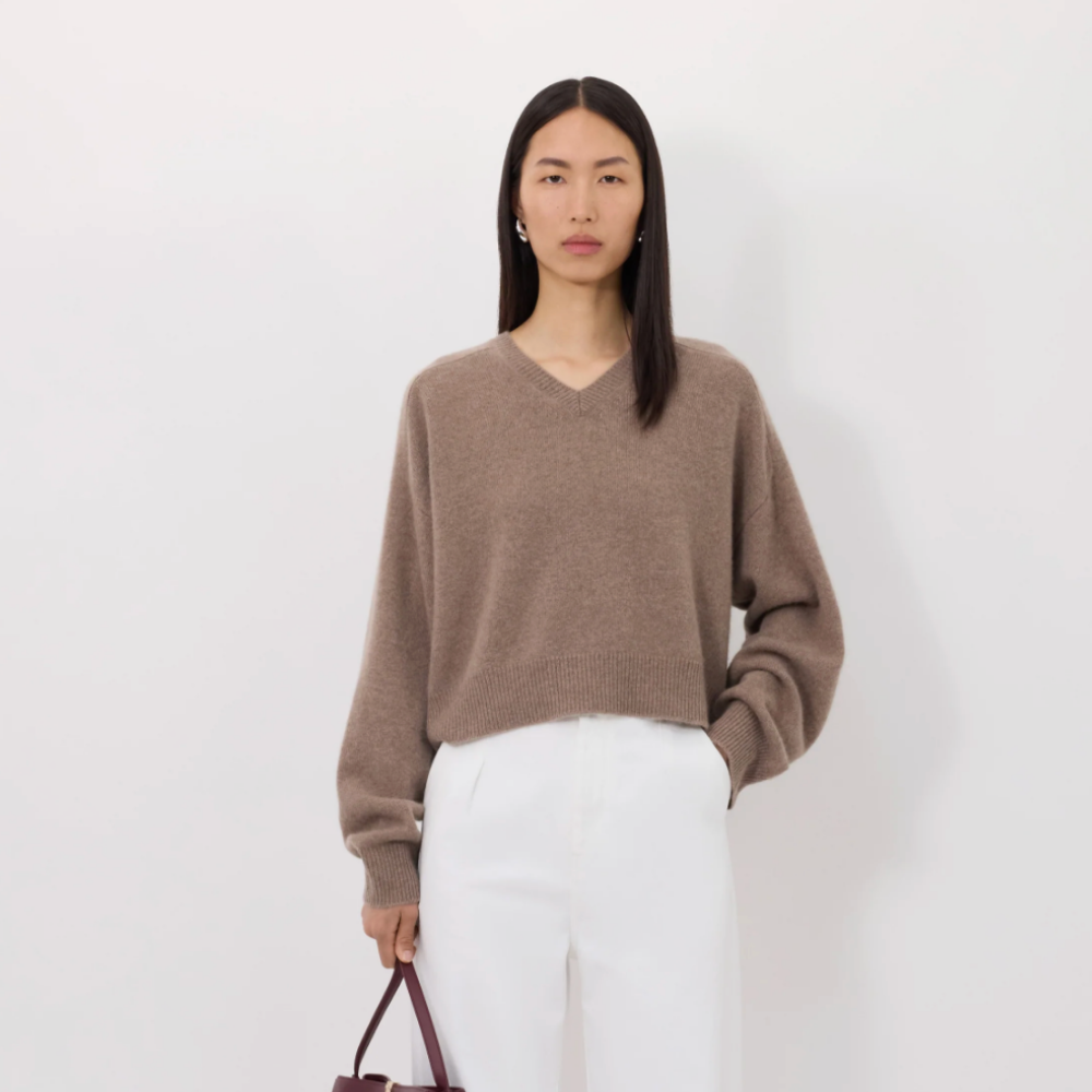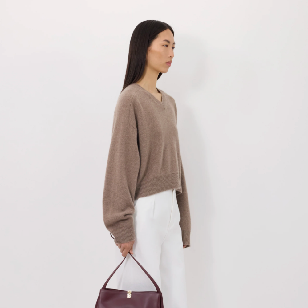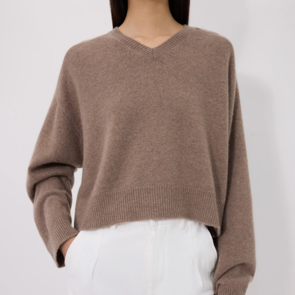 Luxurious long sleeves sweater with V neck and boxy fit, slightly cropped.
