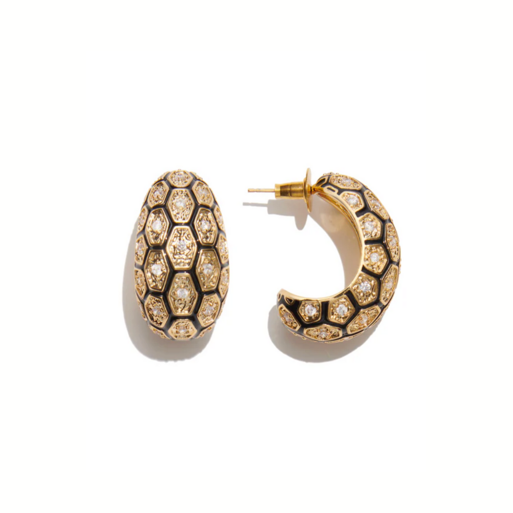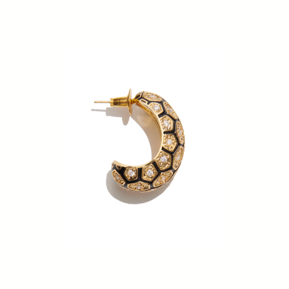 Chunky earrings in black enamel covered in golden hexagons with white zircons at the centre.