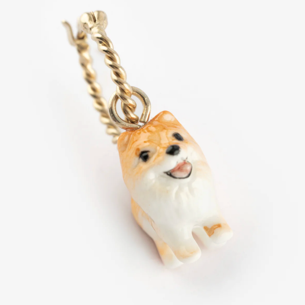 Brass with gold plating with a small porcelain dangling Spitz dog.