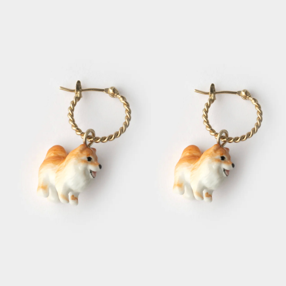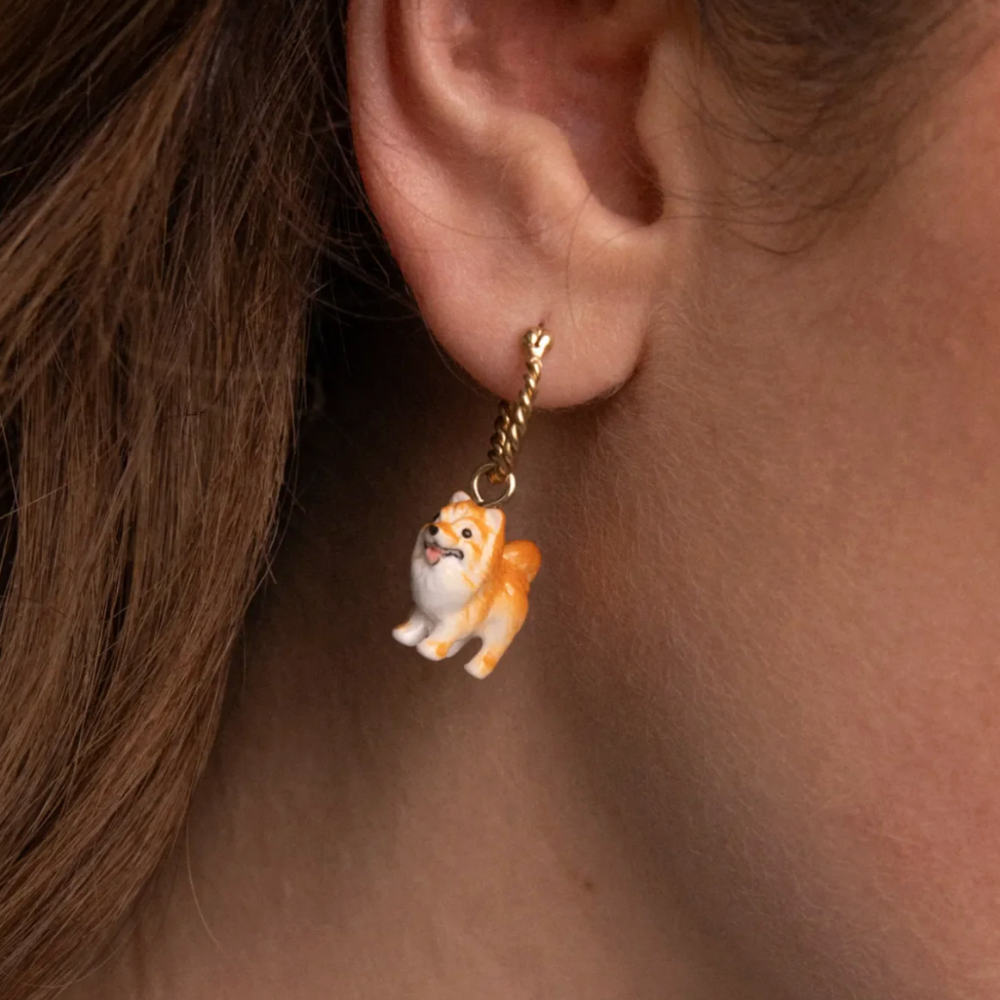 Hand painted porcelain mini Spitz dogs on hoops.