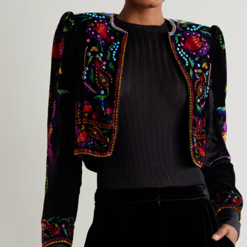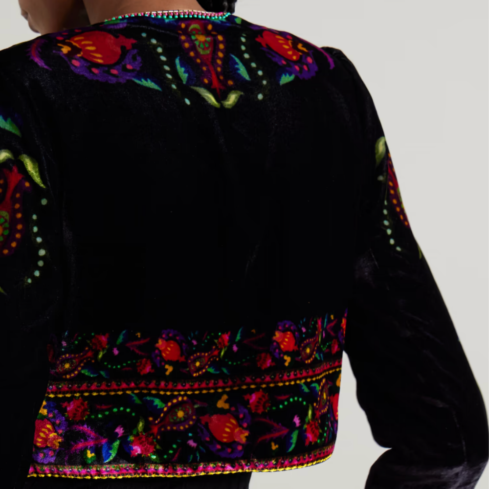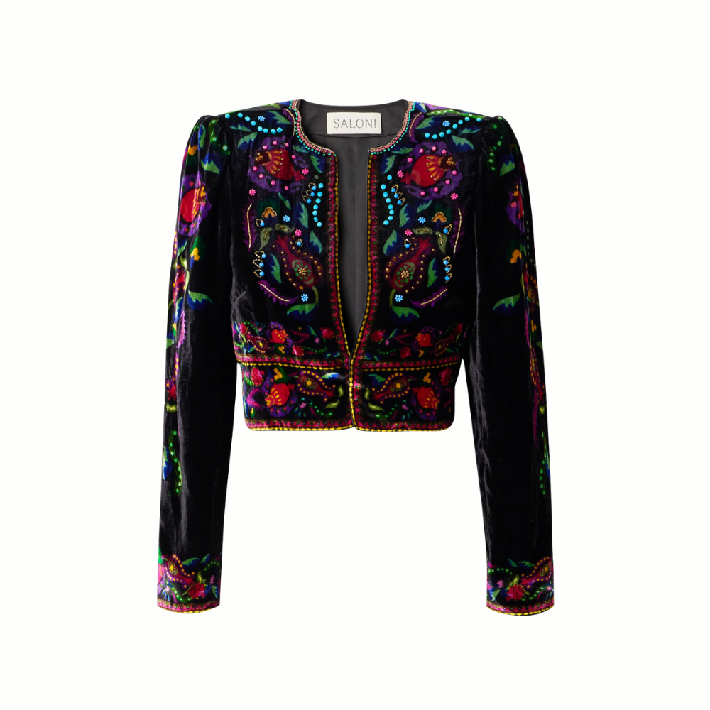 Cropped velvet jacket featuring a round neckline and structured shoulder pads for a sophisticated silhouette.