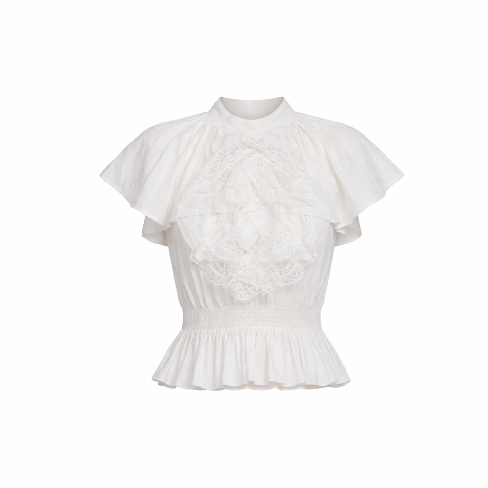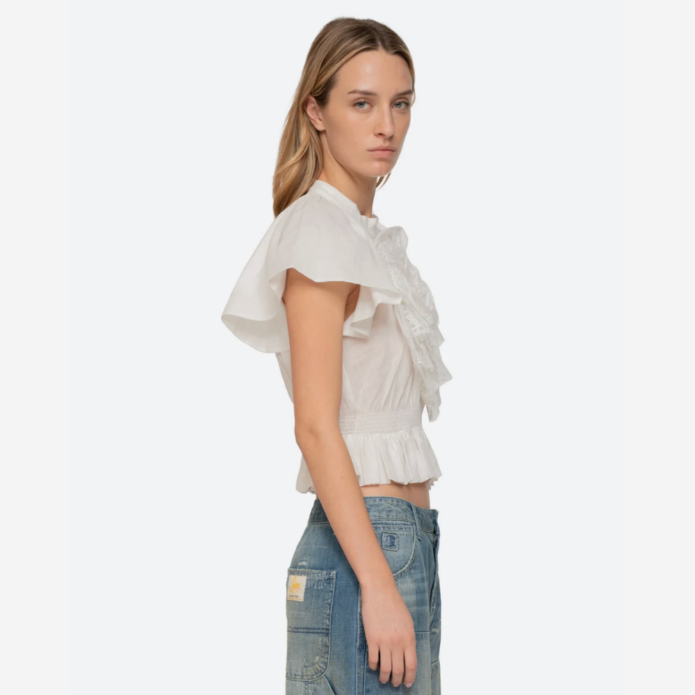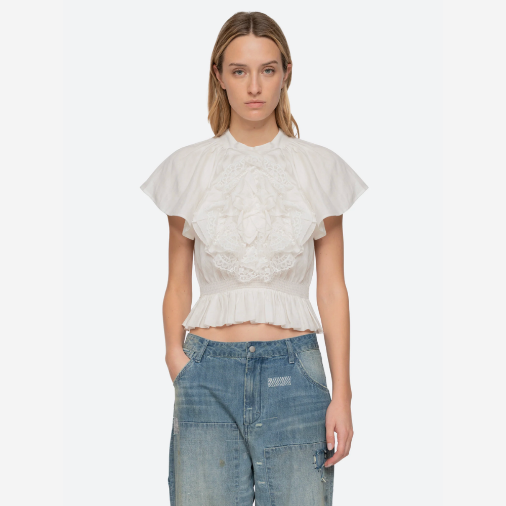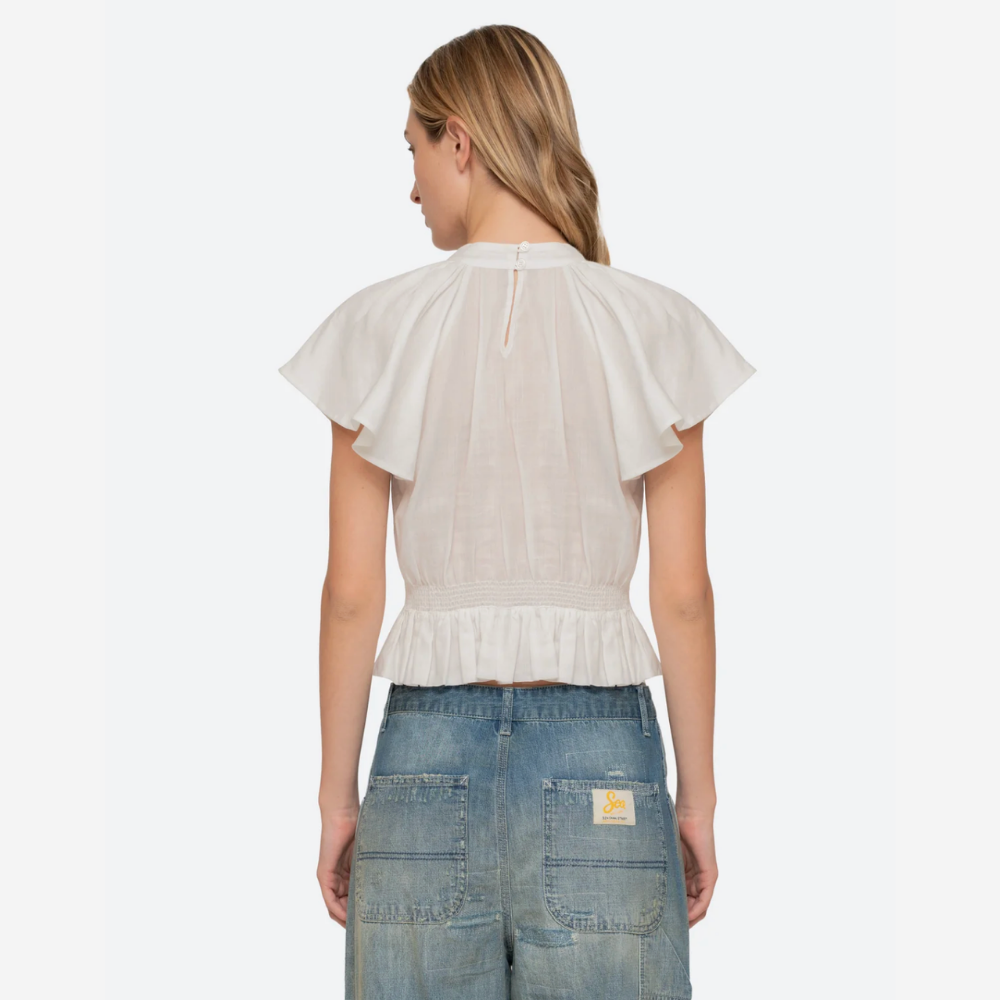 Designed with a high neck and cropped silhouette, it's finished with a smocked waist that subtly flares into a soft peplum.
