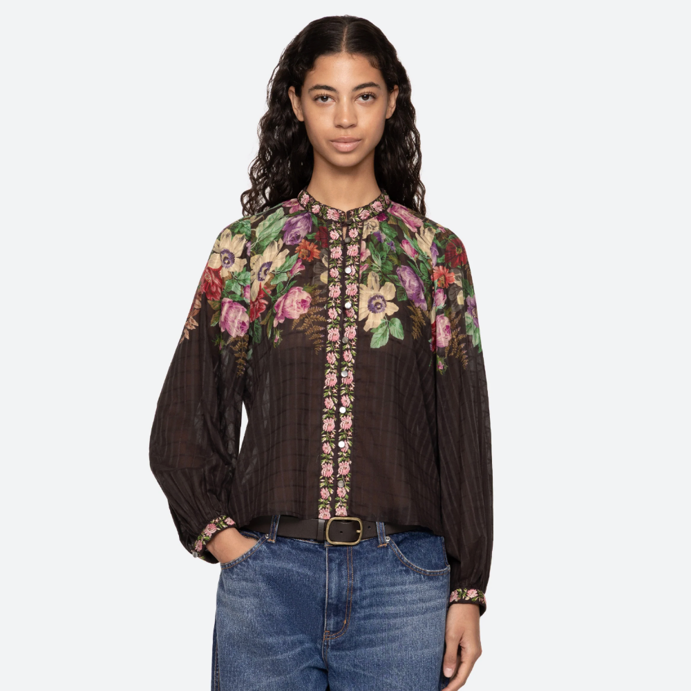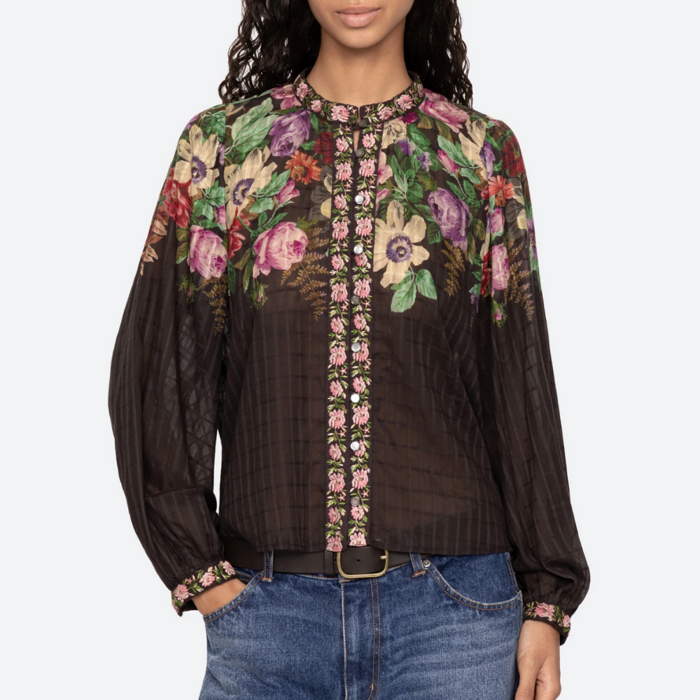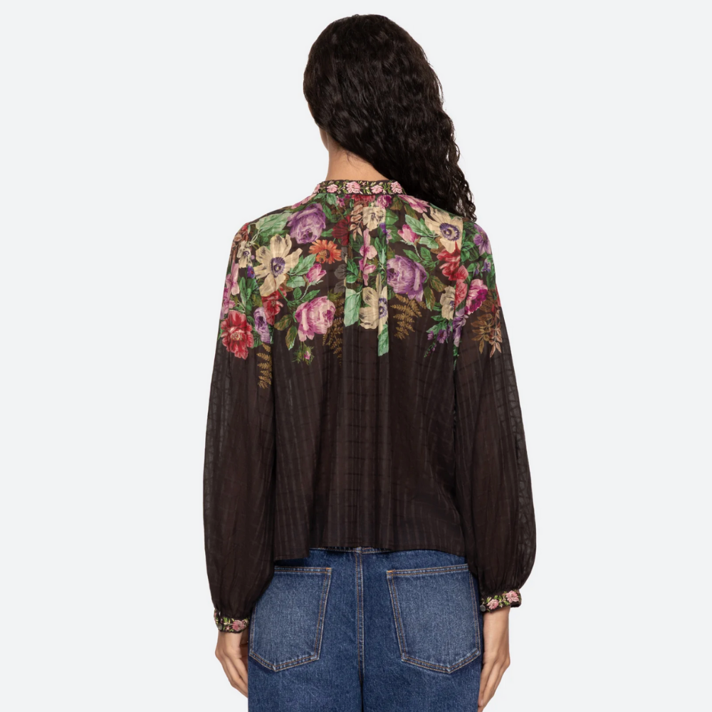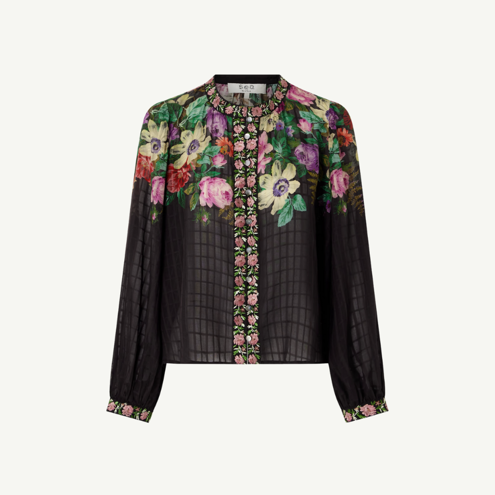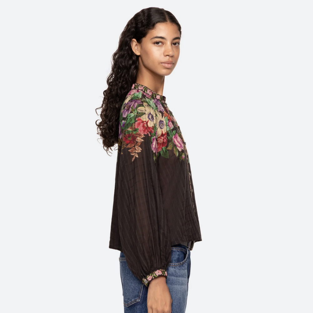 Viktoria sheer blouse in chocolate brown with floral print shoulder placement