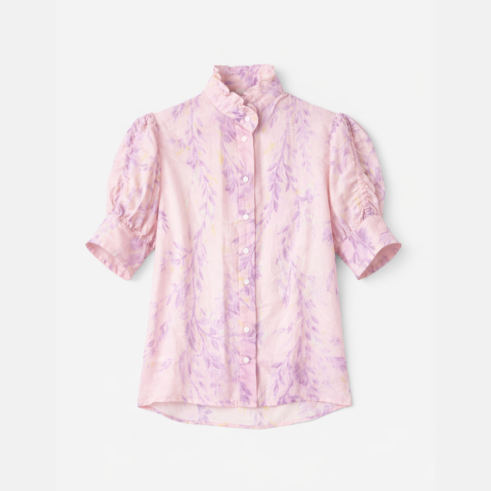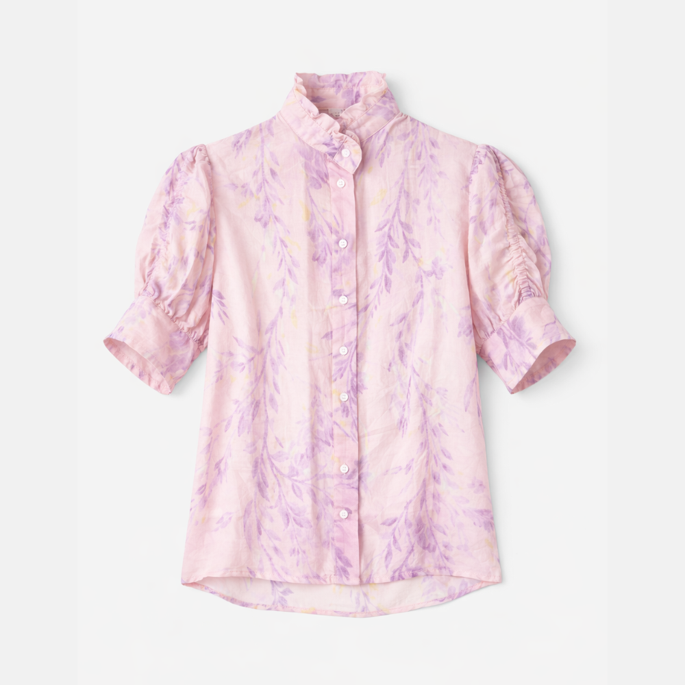 Featuring a frilled high collar, Gigot short sleeves & full button closure.