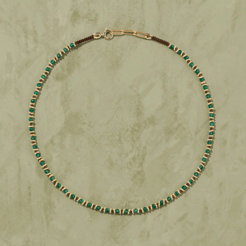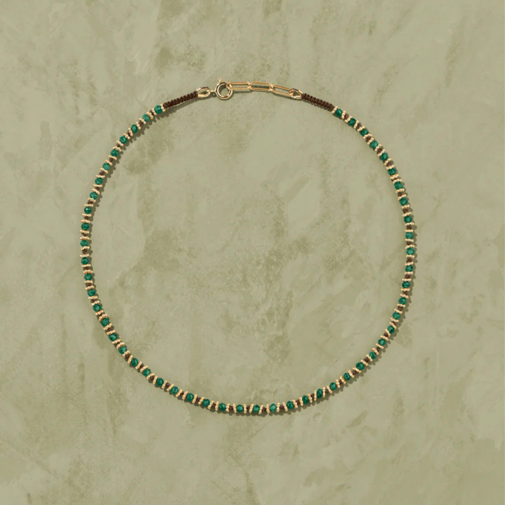 Tityaravy Kamala necklace in malachite and brushed silver stones on a brown thread.
