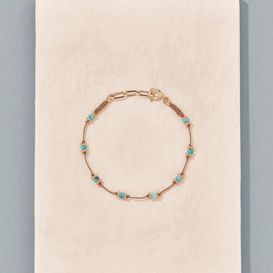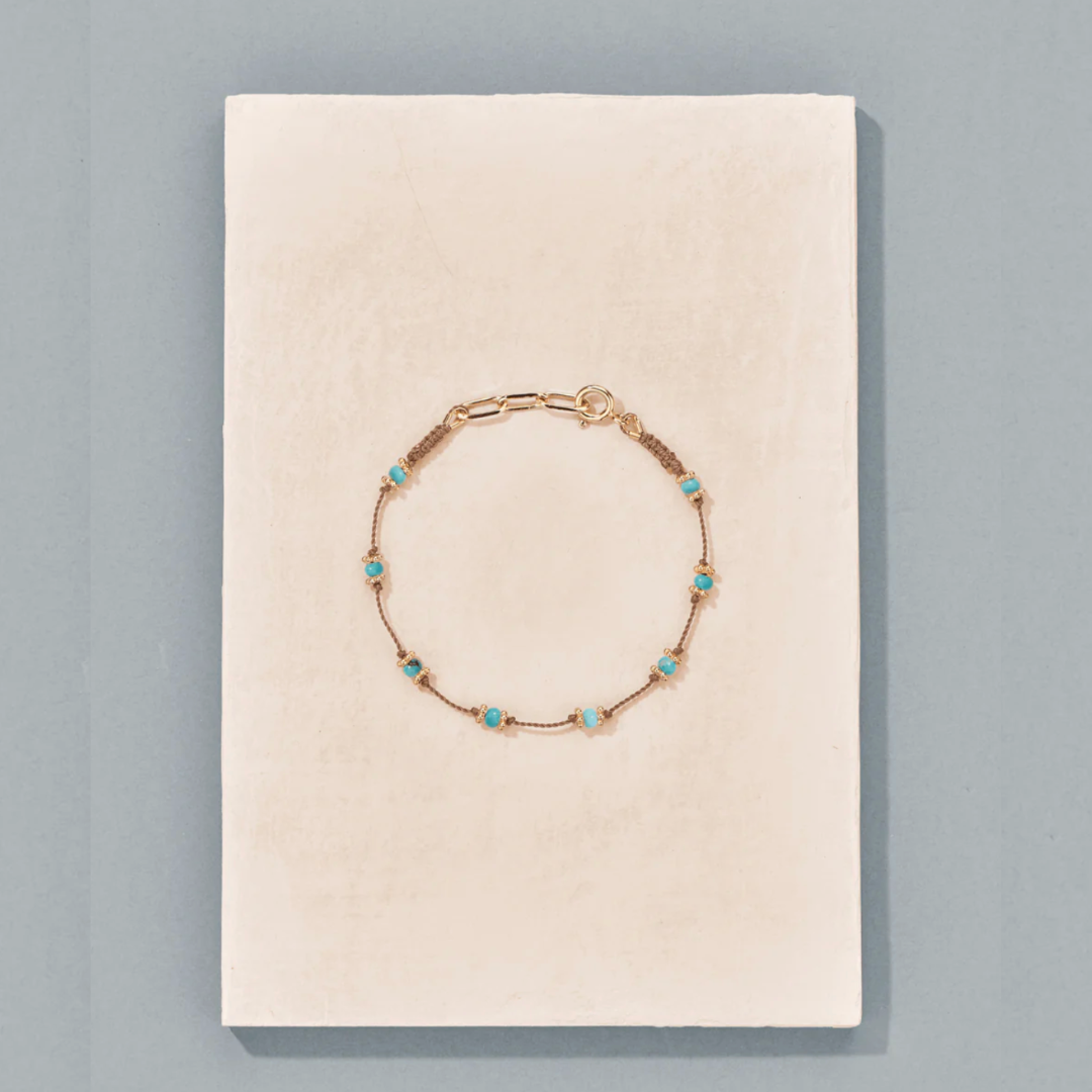 Tityaravy Lotus bracelet in turquoise pearls and brown thread.