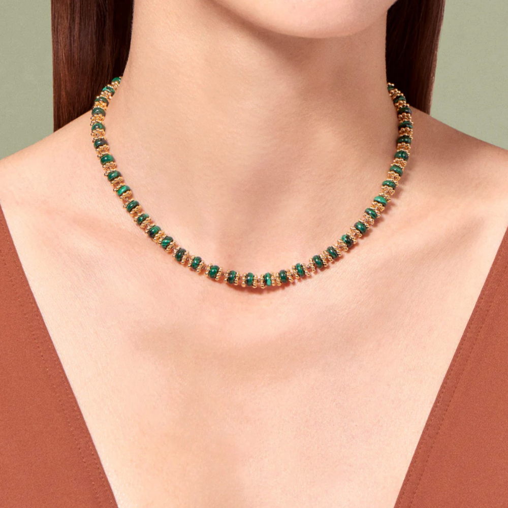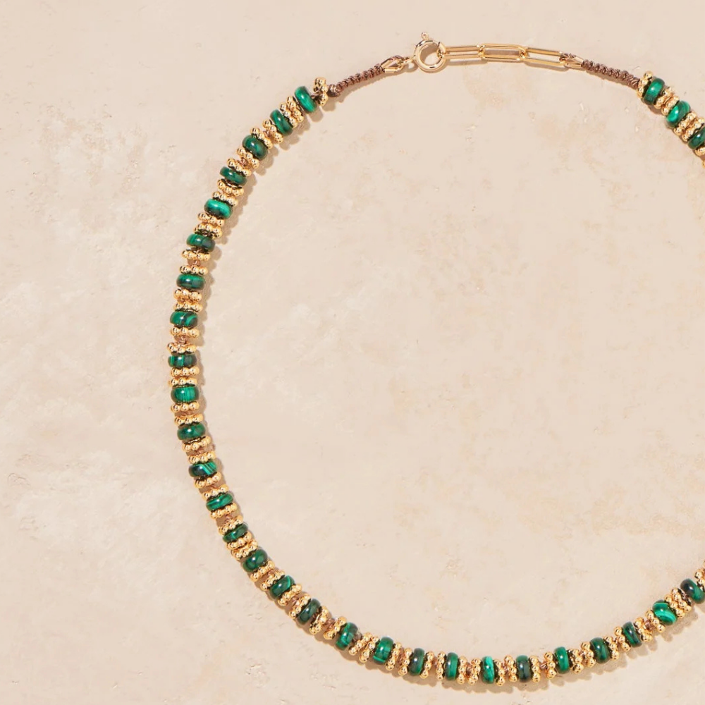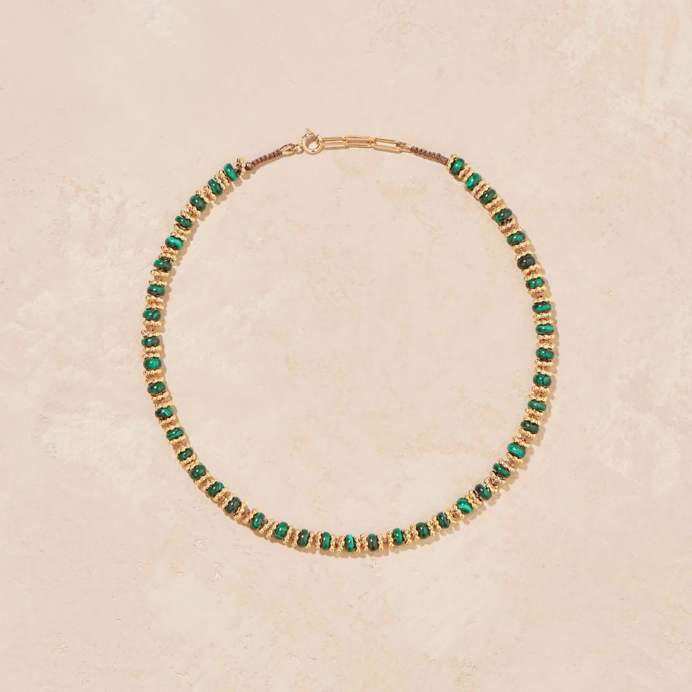 Tityaravy Seda necklace in malachite beads and gold plated silver.