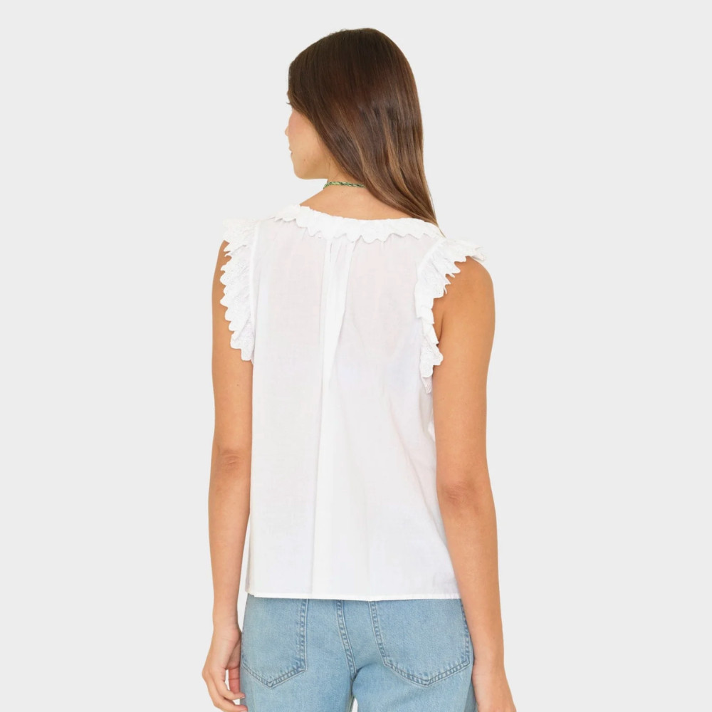Sleeveless top with deep V-neck collar and decorative ruffles on shoulders and collar.