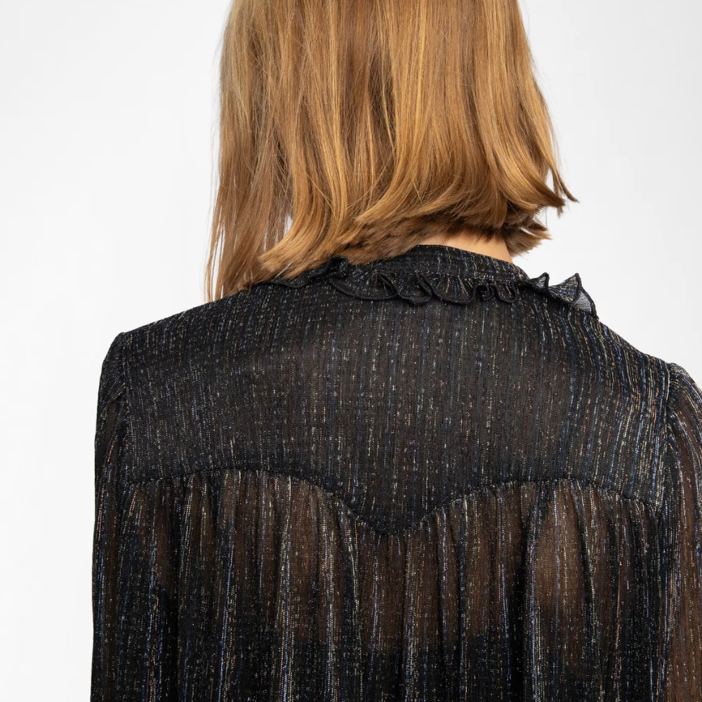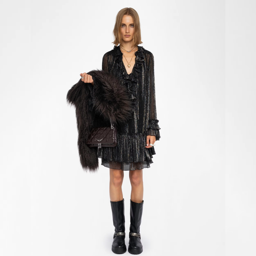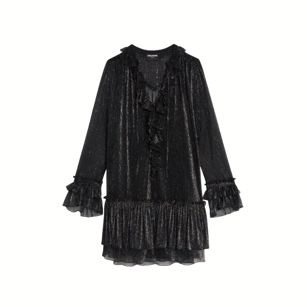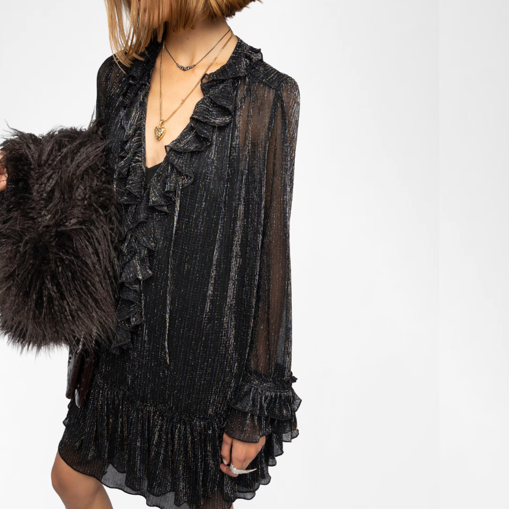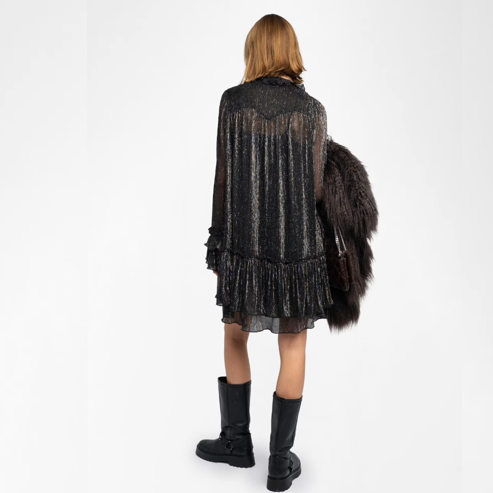 Short dress in chiffon with multicolour metallic fibres, long sleeves.